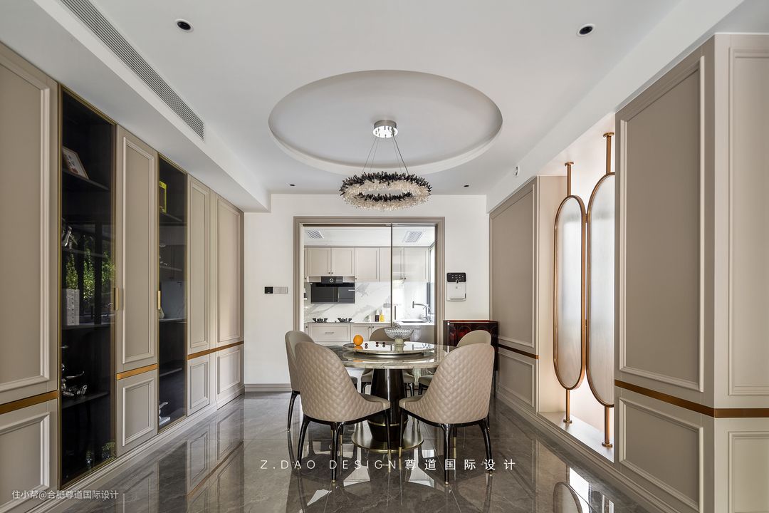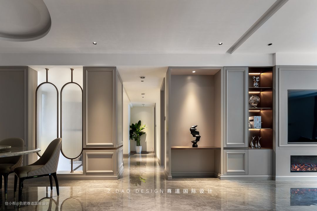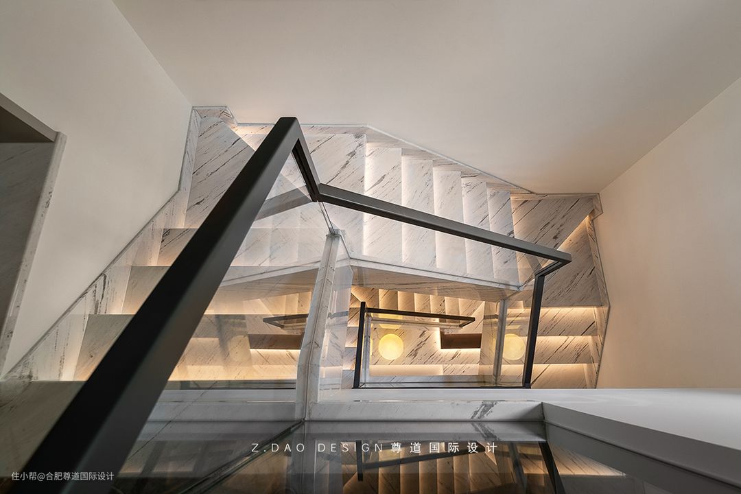 。第二个踏步我们做了整个延伸,第三个踏步我们做了区分材质的处理,采用了木饰面进行一个包裹。楼梯口与餐厅和过道相连,我们设计了金属与长虹玻璃组成的造型屏风。