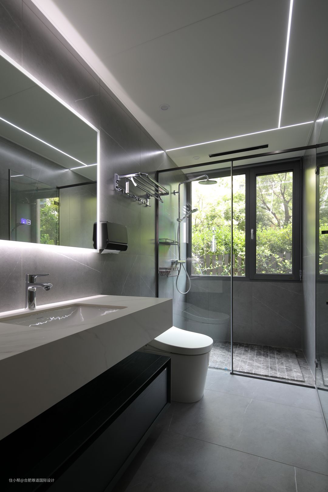 卫生间干湿分离,经典简洁的入墙式龙头,双台盆设计,悬浮式浴室柜设计更轻盈,颜值和实用并存。