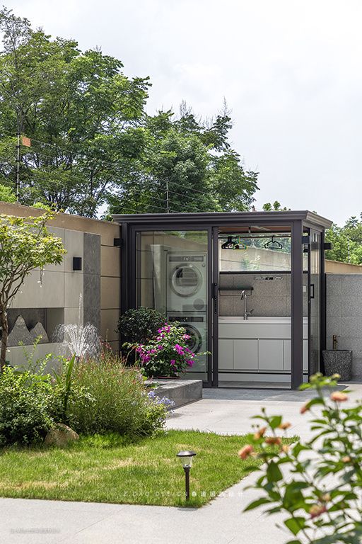 院子里我们设计了洗衣房,布置了洗烘一体机,洗衣柜,以及晾衣架。