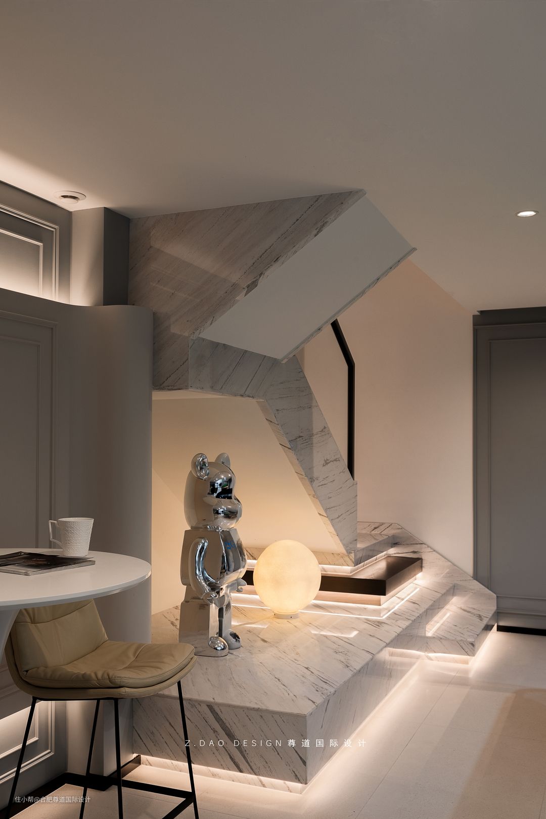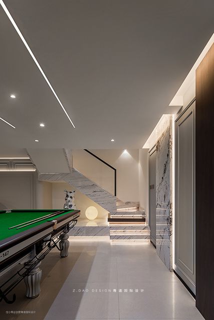 台球桌的右边是一面造型墙,把这面墙分割成五份,做不对称造型,PU线条继续延用,PU线条的区域刷艺术漆,中间两个区域做突出墙面的造型,一处用岩板铺贴,另一处用木饰面铺贴,内口用灯带点缀。空间有层次感,更丰富。 楼梯