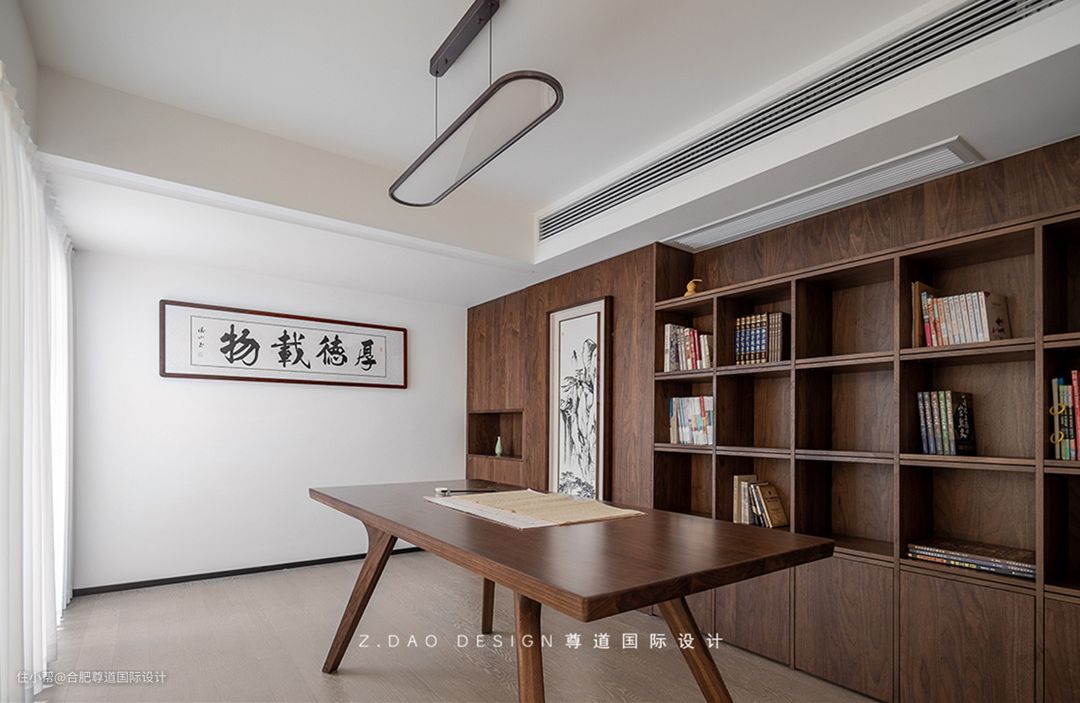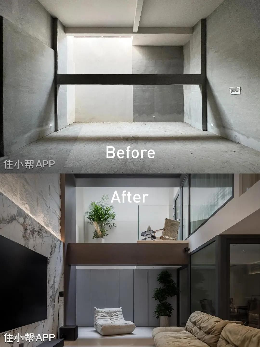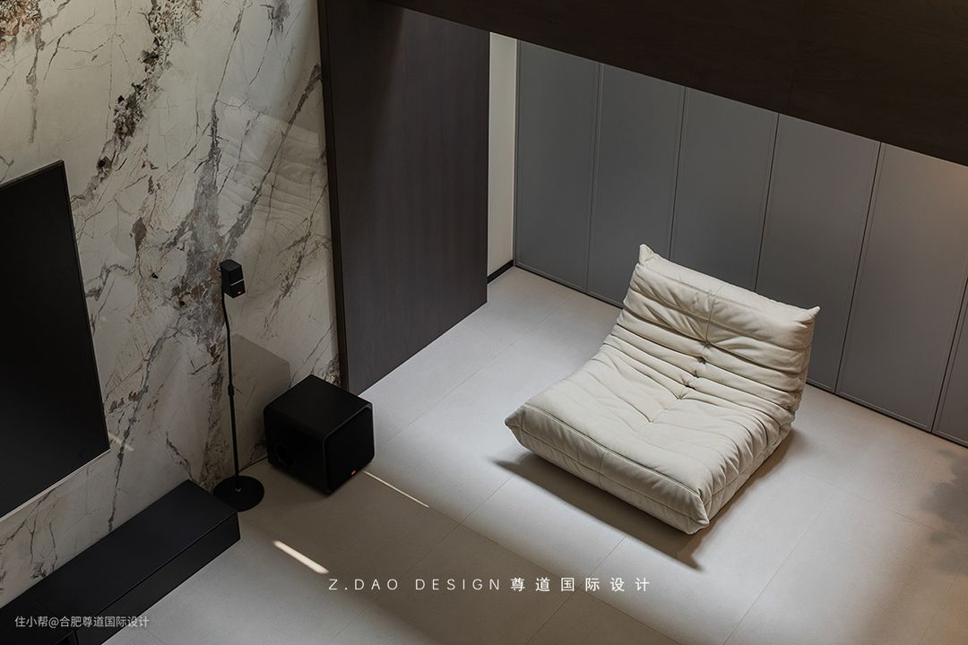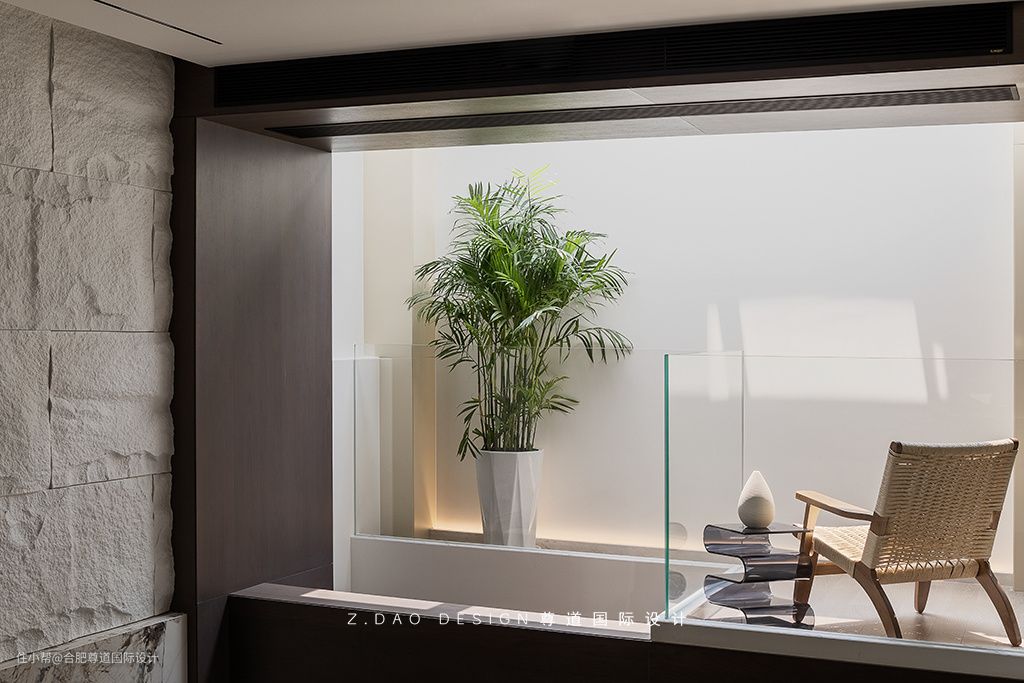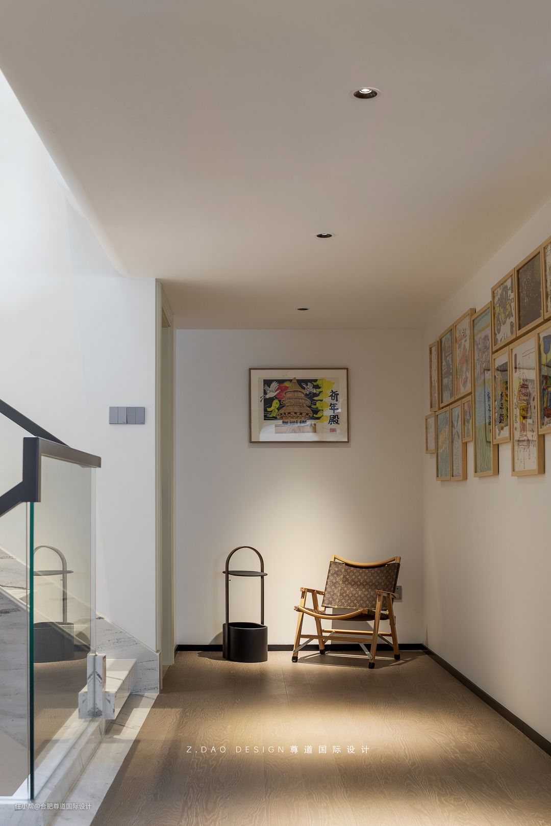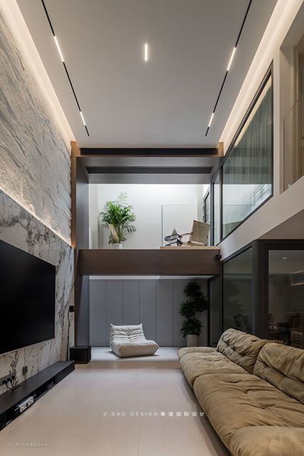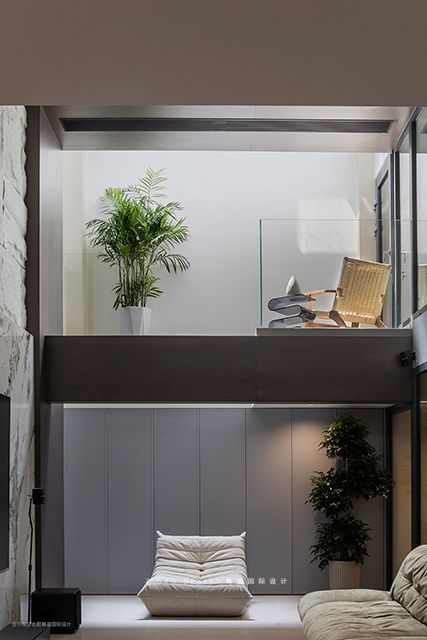 书房后面做了整墙的书柜,收纳空间足够,在顶上除了主灯,做了一个45°的洗墙灯。在面向挑空的那面墙,做了一面落地的玻璃,疲乏时可以像远方眺望。这个天井以及这一块采光最好的位置设计了一个阅读平台,从书房这边过来,放把休闲椅,看本书,喝杯咖啡,晒晒太阳,很惬意。