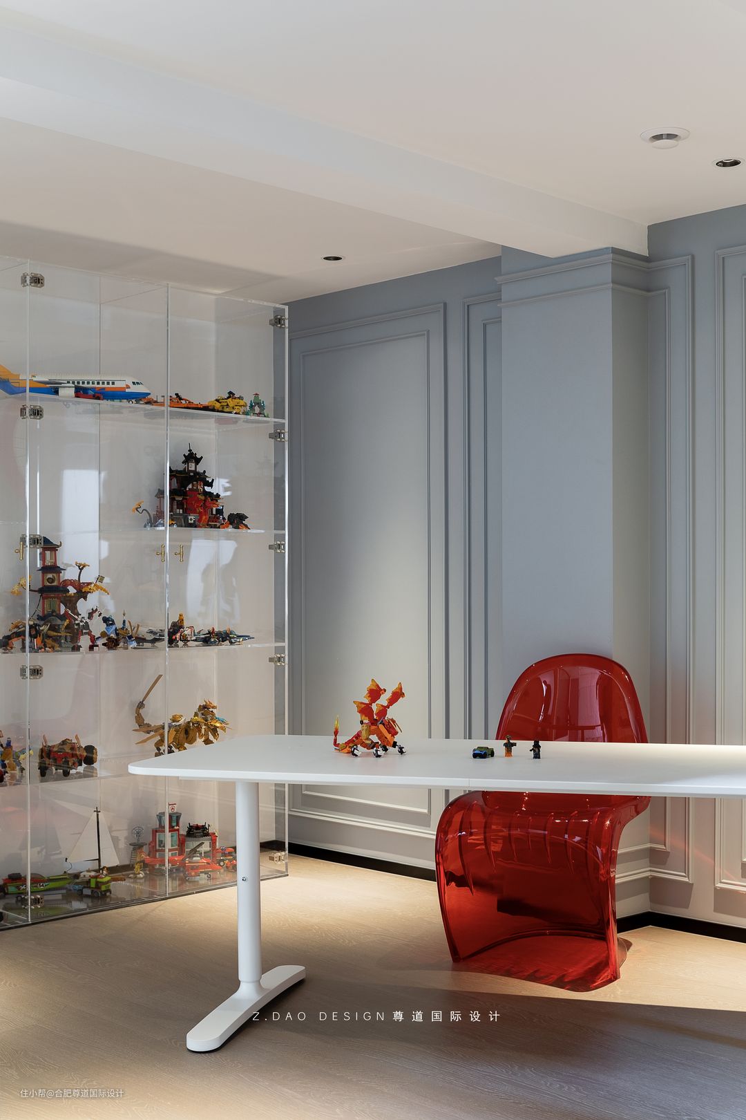 靠墙定制了一组亚克力的透明展示柜,旁边放了一张书桌,可以画画、手工,父母与孩子之间交流性更强。平时业主可以在这里进行一些亲子的活动。