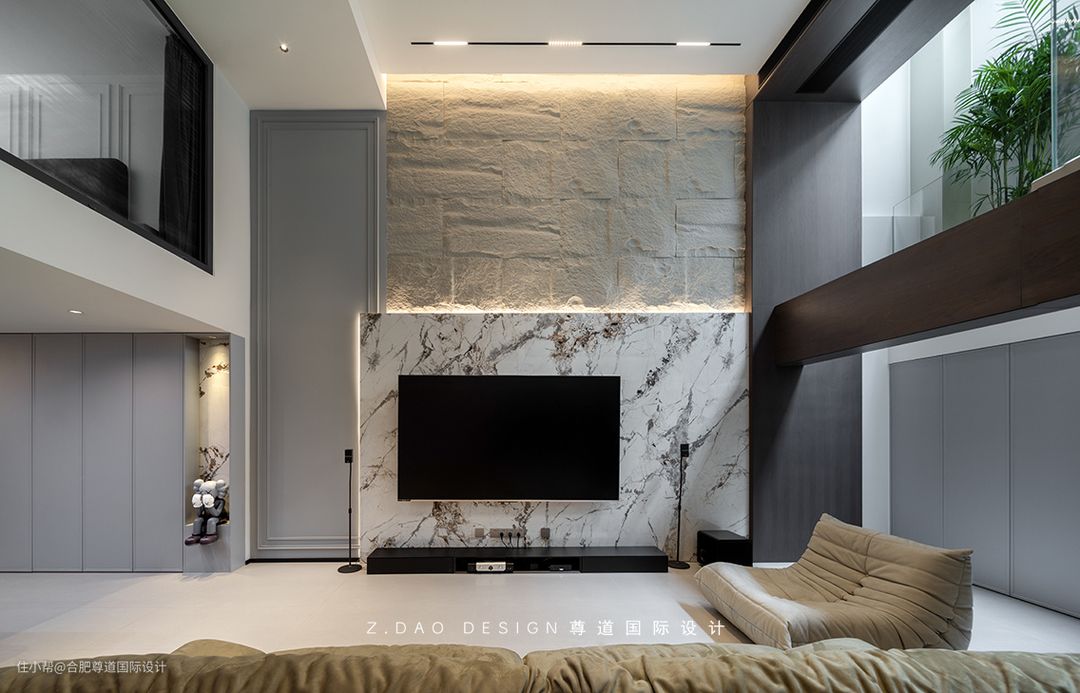 地下室我们保留了部分挑空,做了挑空会客厅,日常在这里会客、观影、游戏,都可以。背景墙我们用了4种材质,PU线条与艺术漆、石皮、岩板、木饰面。石皮与岩板之间我们做了灯带的处理,天井原始柱体和梁体,我们用木饰面进行包裹,天井下我们设计了储物柜,还设计了"L"型平台,作为夹层书房阅读平台的延伸。