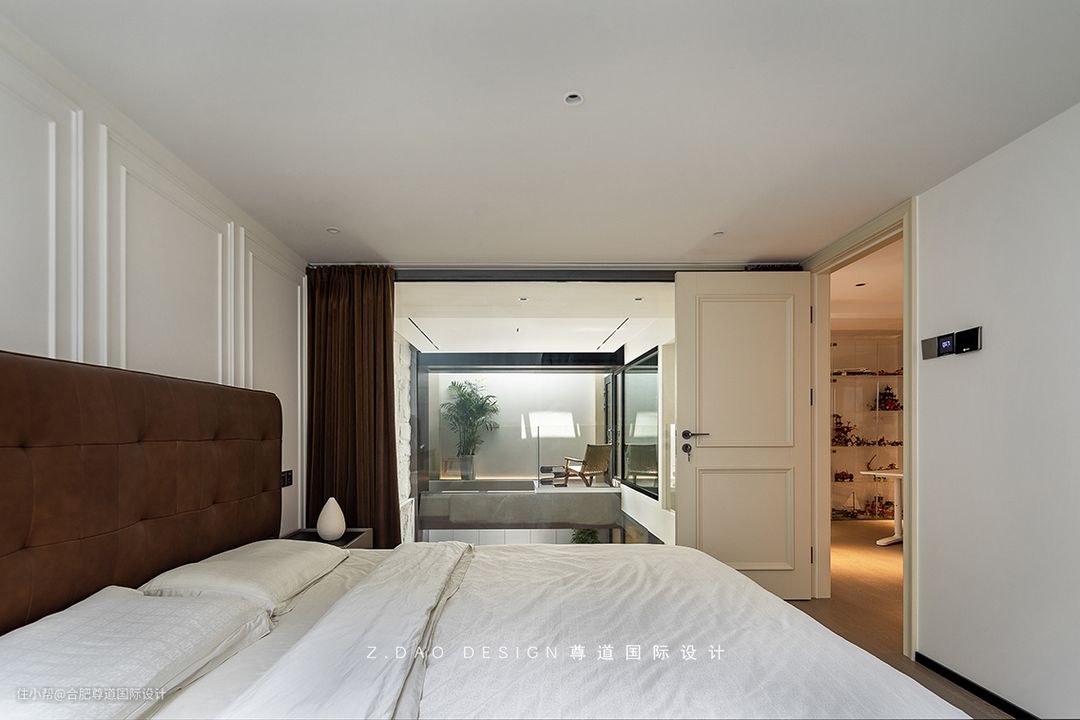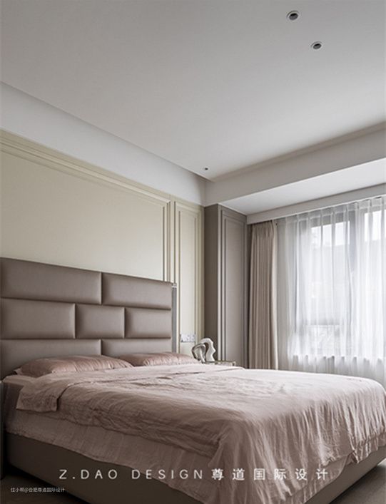 卧室内部空间以暖白色和咖色为主色调,床头背景设计了美式线条,让整个空间简洁又高级。