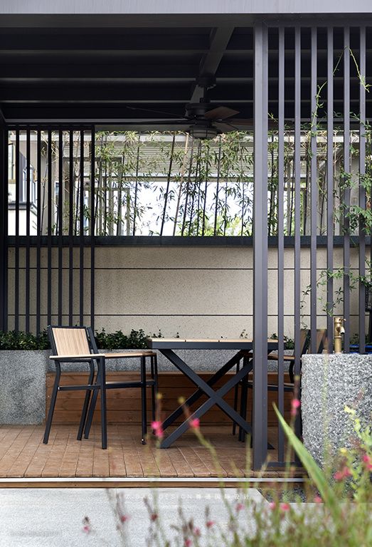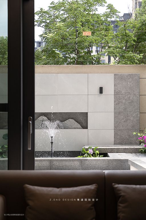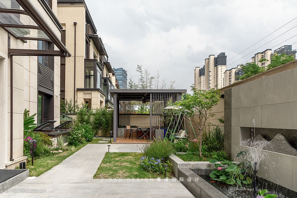 这里是一层私人庭院,通过客厅首先映入视角的是水景,水池里养着几朵莲花几条金鱼。右边是阳光房,左边是凉亭,顺着这个汀步还可以到达侧院的小菜园。