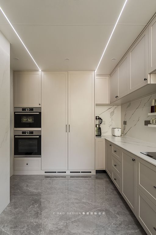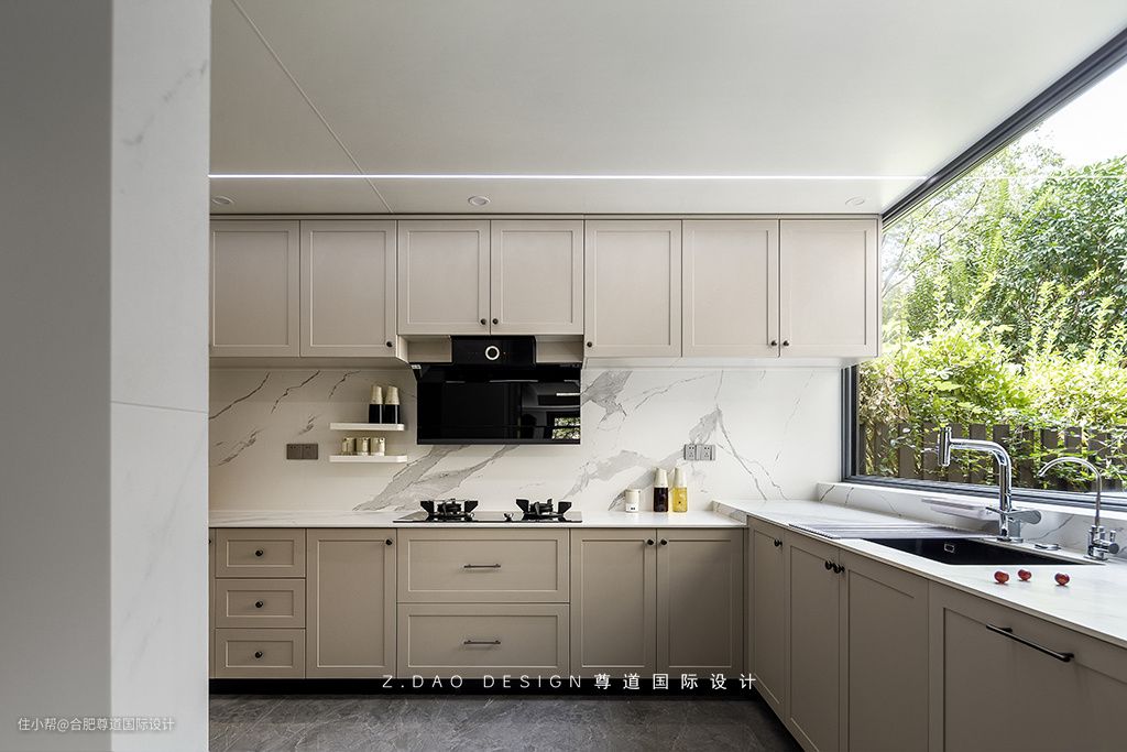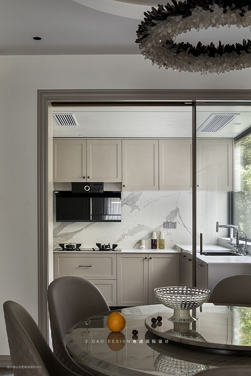 为了避免厨房的油烟问题,同时保证空间的通透性,这里做了三扇玻璃吊轨门,平时开着空间很通透,做饭时关起来油烟不会飘到外边来。厨房的空间U字型的布局,满足了大厨房的需求,一整套的博世橱柜系统,嵌入式的双门冰箱、蒸箱、烤箱。