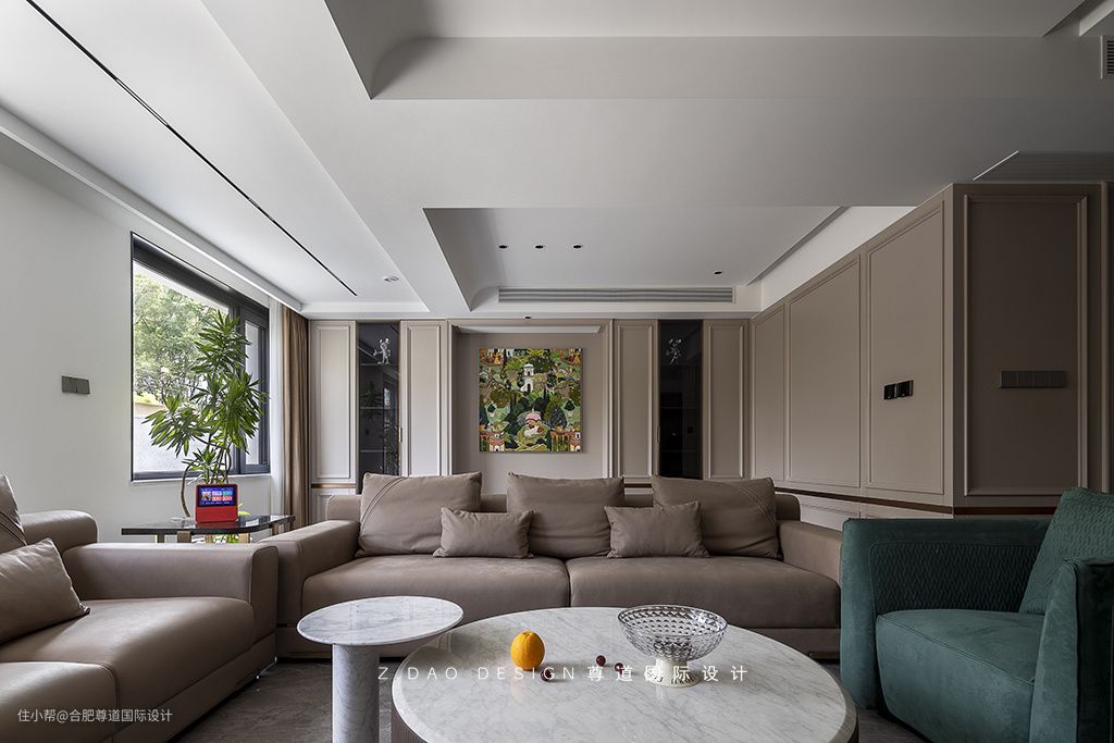 整个空间采用暖咖色作为主色调,选用金属、木作、石材等墙面材质组合,和整个风格很契合。沙发背后用相同的材质做两组柜子,中间放一台钢琴。