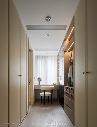 主卧左侧做了一个假的立柱,让整个空间更加协调。靠窗部分我们做了一个下沉式的飘窗台,拉开窗帘可以看到庭院中的景色。床的左边我们可以看到一扇门,推开门就是主卧的衣帽间,衣帽间做了柜门和玻璃柜门的设计,往里走靠窗的位置做了梳妆台。