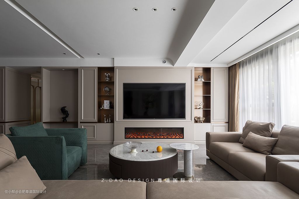 从院子进入室内,首先看到的是电视背景墙,原始阳台打掉,利用原始管道做了玄关收纳电视一体多功能柜子,壁炉的增添让整个空间更加温馨。沙发后面我们预留了亲子活动区,背景墙设计了收纳柜和展示柜,中间的区域预留出了钢琴区,给孩子长大后使用。