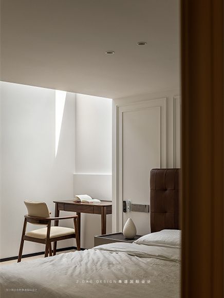 次卧位于地下室夹层部分,我们利用了北边的采光天井,在采光井下设计阅读区。南边我们设计的落地窗,可以让光线更好的进入室内,使整个卧室更加通透。通过落地窗,可以俯瞰整个地下室,让楼上楼下互动性更强。