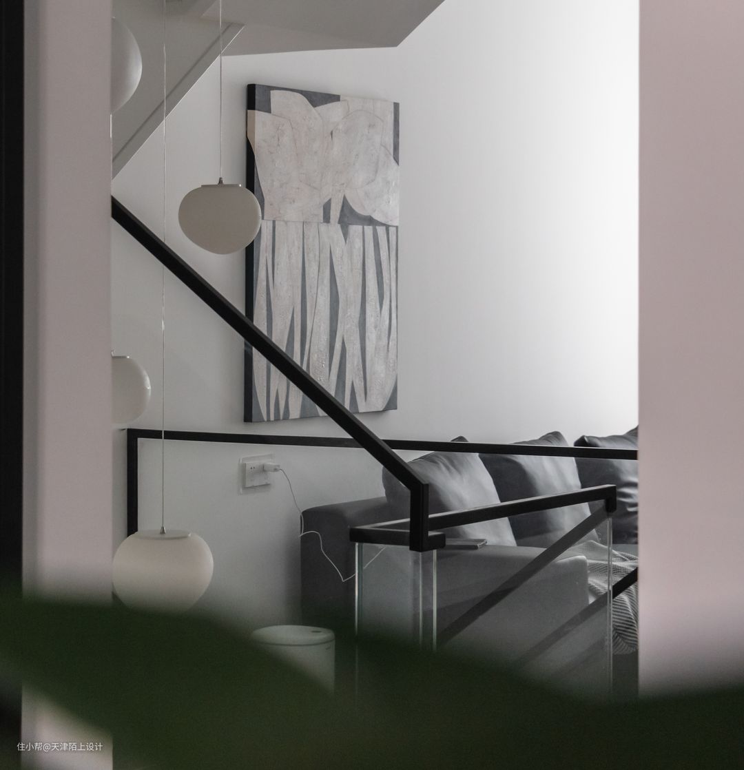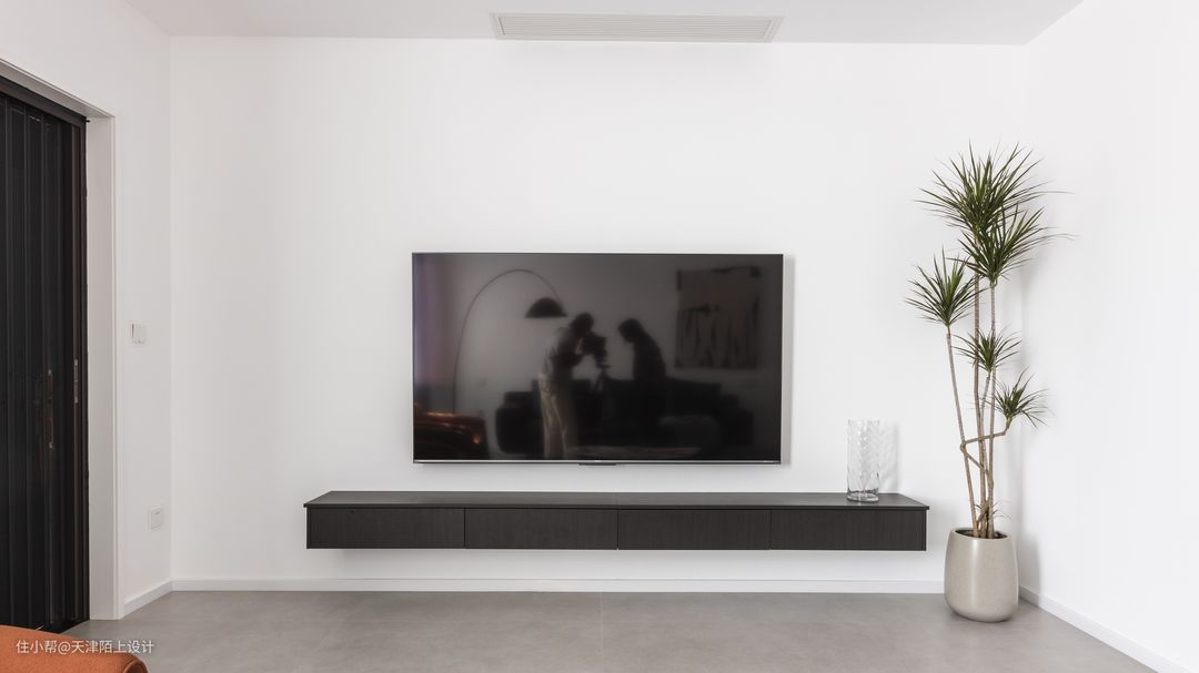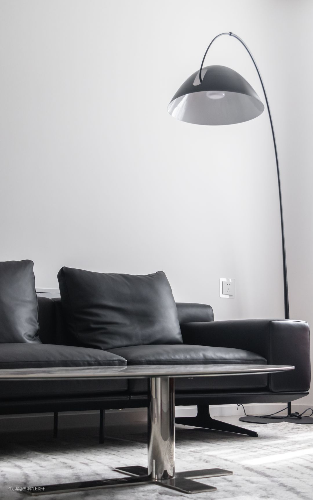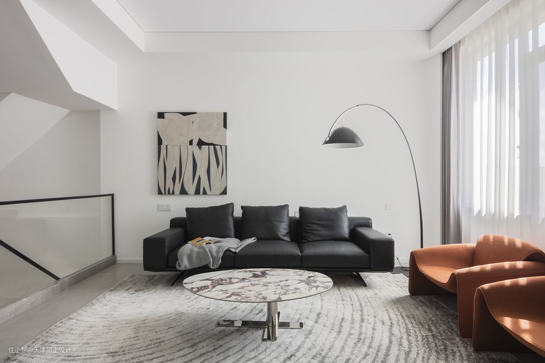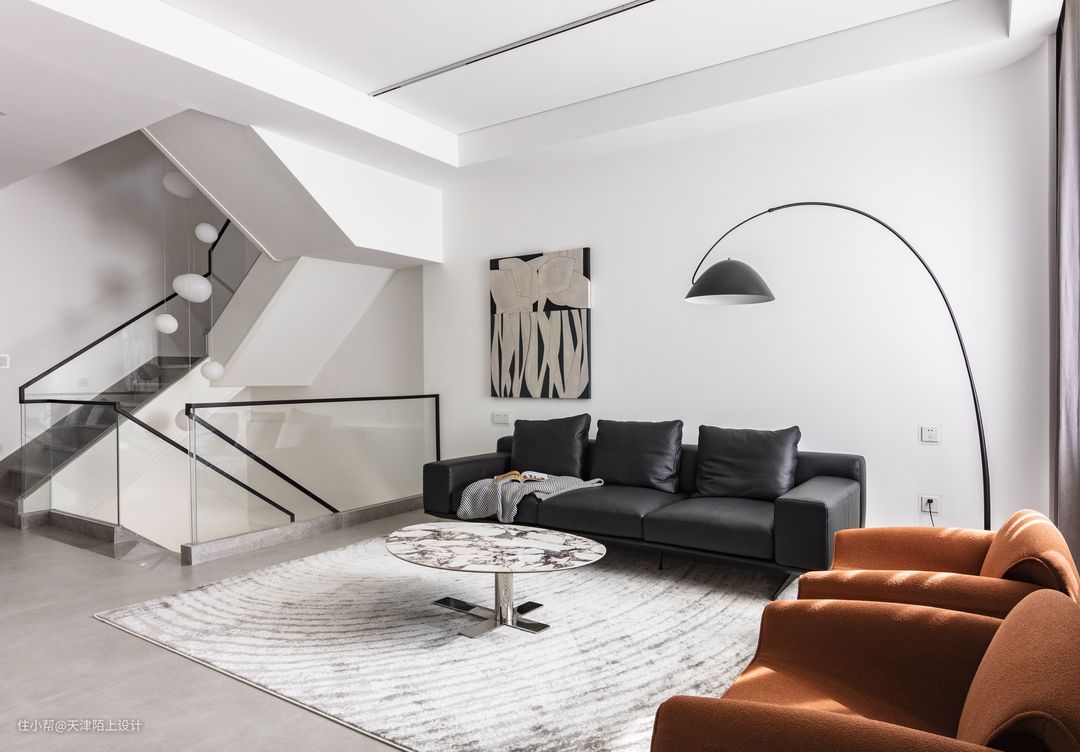 整个客厅没有过多装饰,无主灯的设计让整个客厅显得的更加高挑 大白墙、浅灰色沙发和黑白纹路地毯,在客厅中被运用得淋漓尽致 黑白灰为主色调,彰显朴素高级大气之美 家具皆选择了简单而有质感的款 - 弧形电视墙的设计很好的增加了客厅的延伸感。 造型上简洁实用,家具一切从简 通过落地灯与灯带营造空间气氛 放弃传统吊灯的装饰,让整体空间回归到最自然最纯粹的状态