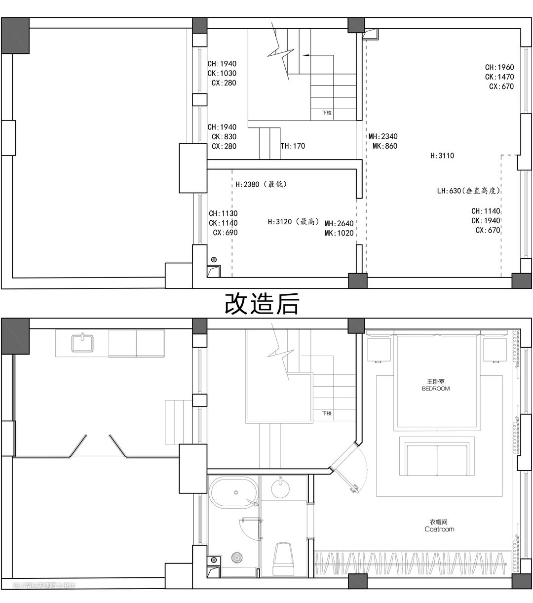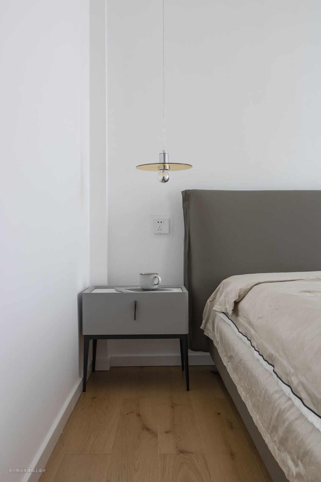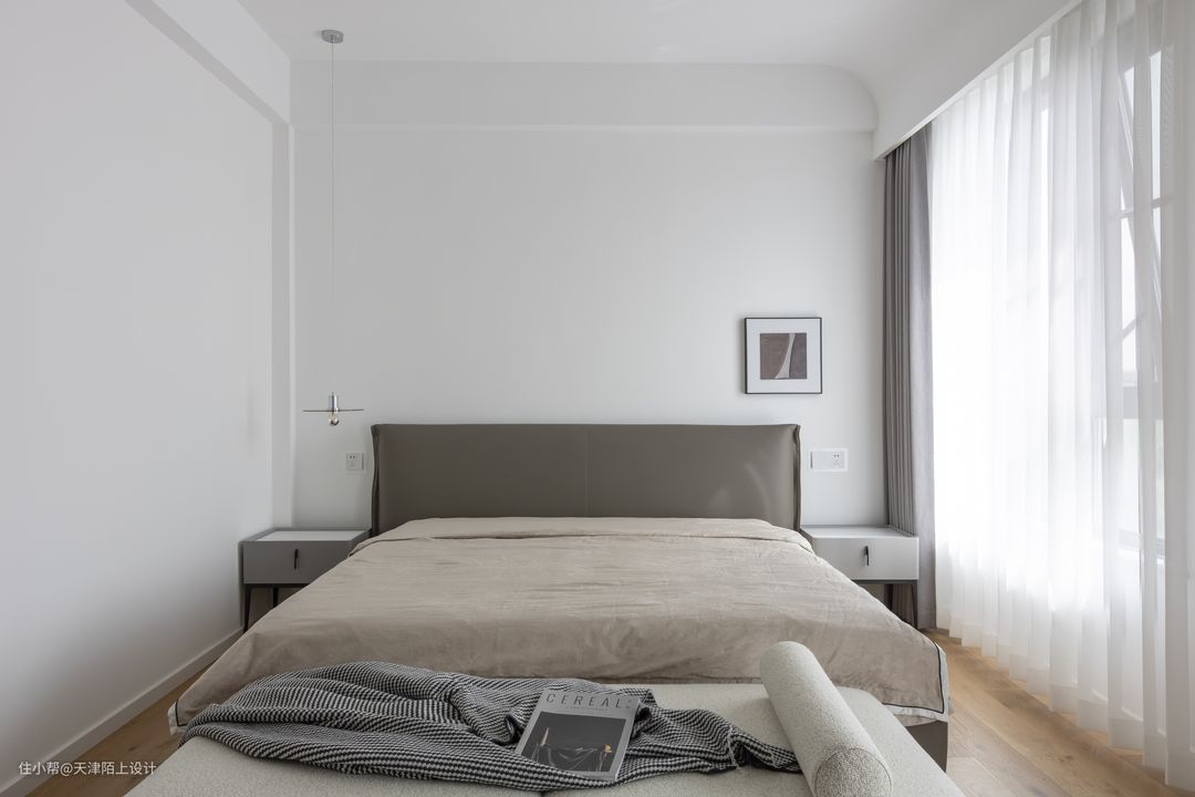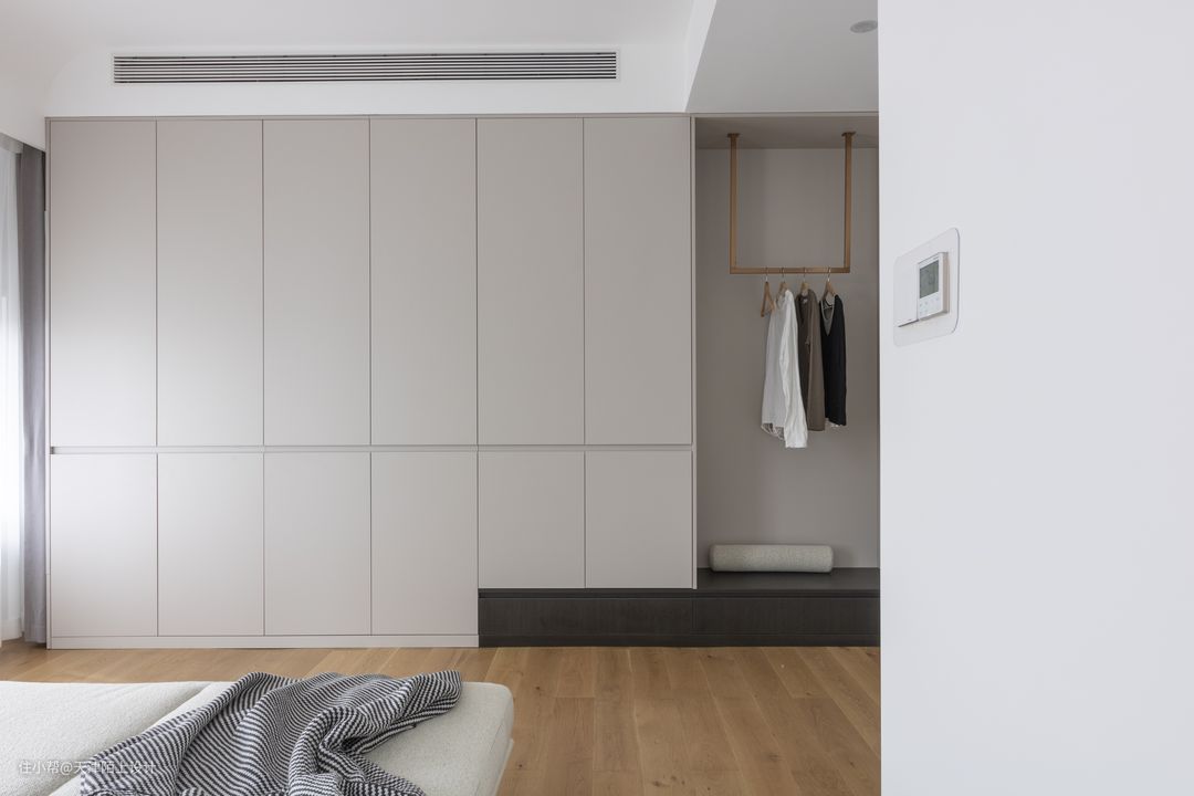 三层为主卧套房,斜切房间门成为整个房间的亮点 不仅让过道变的宽敞,而且让进门后的主卧也无限放大 敞开式定制架的设计可随手放置业主的衣服 将舒适的双人床放在首位 缓和的色调更有助于二人睡眠