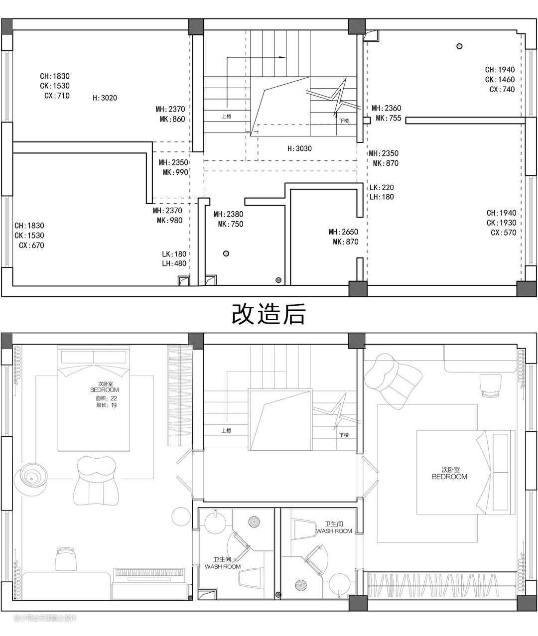 虽然是别墅,但是整体的面积比较小,结合客户居住人口和需求,整案设计后为3室4卫的结构空间。考虑到造价负一层整体就是白墙设计,通过一面墙的镜子扩宽整体空间,一家人可以在这个空间运动,健身,瑜伽,休闲,吊顶采用圆形线性灯,设计感十足,弧形沙发的使用,让这个地下室实现无限的可能。 · 将一楼的门厅位置外移和厨房相连,增加入户门厅的同时也扩大了厨房的空间 · 重新分割厨房和卫生间之间的墙体,缩小卫生间的同时也增大厨房的空间 ·将整个过道的墙体往卫生间偏移,以保证二层两个套房过道的舒适度 · 斜切房间门成为整个房间的亮点,不仅让过道变宽敞,而且让进门后的主卧也无限放大