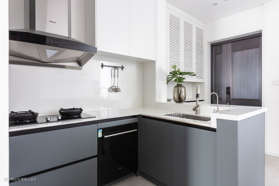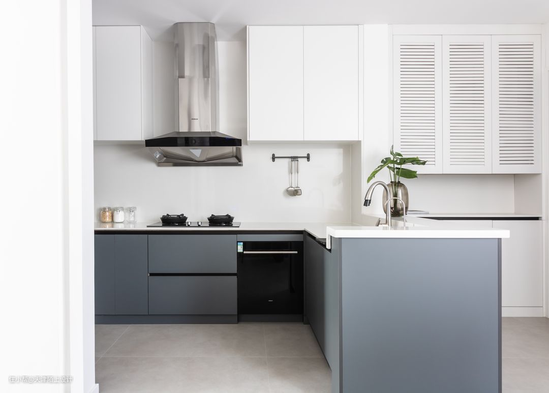 厨房布局为典型的U型厨房,烹饪做菜动线十分顺畅 吊柜地柜整体色风格调统一,均用的奶白色柜门,非常的有质感 吧台的设计,拓宽了整个客厅的视觉效果,让整个厨房餐厅通透了很