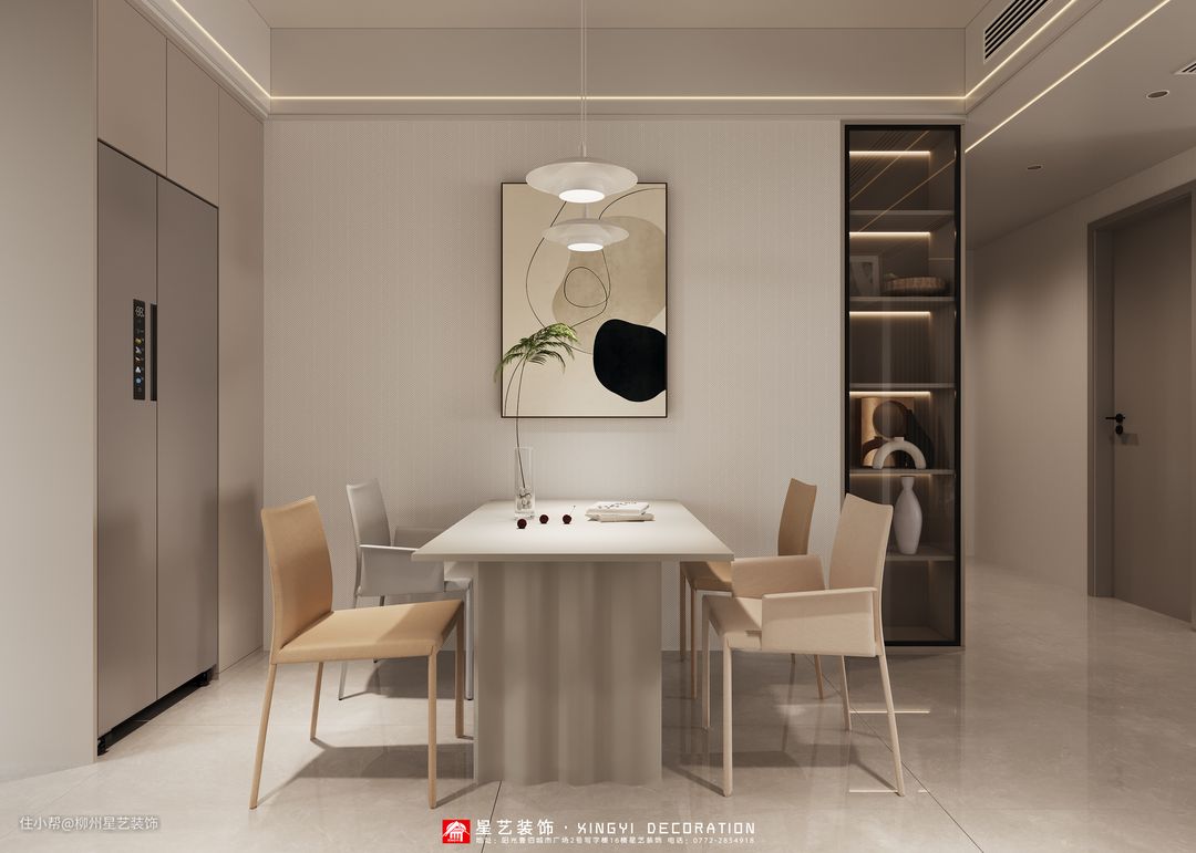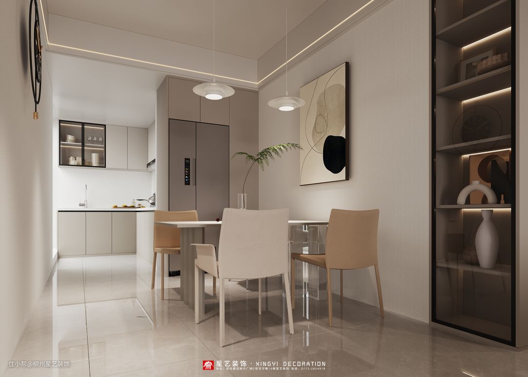 云岩白与暖橘拼色的实木餐桌 赋予餐厅更多的层次与温柔 厨房就在旁边 增加烟火气息
