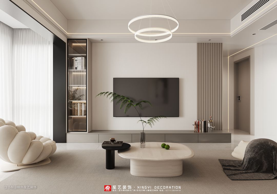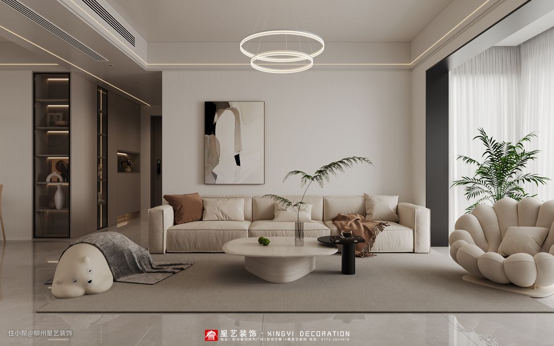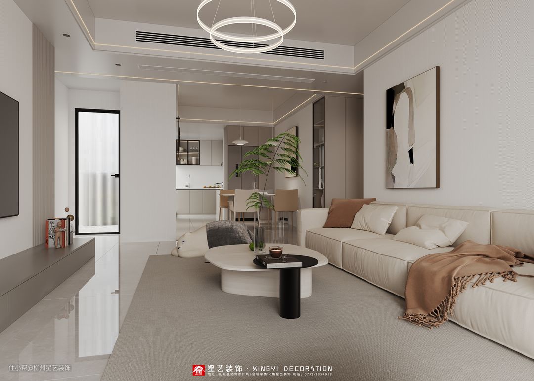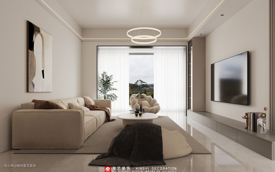 采用奶油调的“感知集合” 保证客厅洋溢着洁净温暖的气息 通透的落地窗帘增加光亮 大面积的一体式留白 让空间多了呼吸感