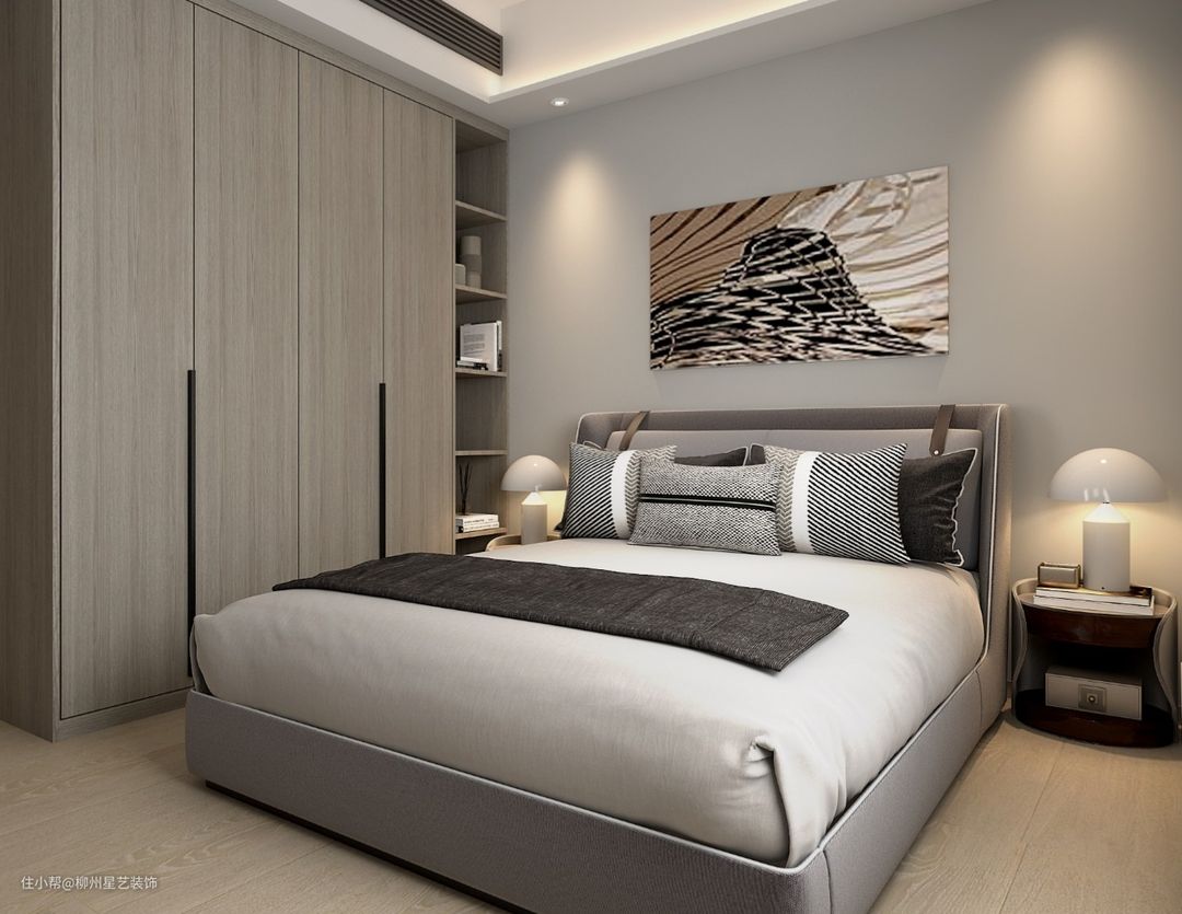 主卧沿用客厅配色 与此同时增加墨黑色挂柄 更添大度沉稳 衣柜和墙体自然衔接 视觉上拓宽了屋内空间