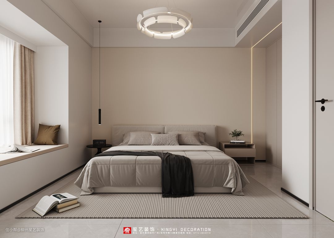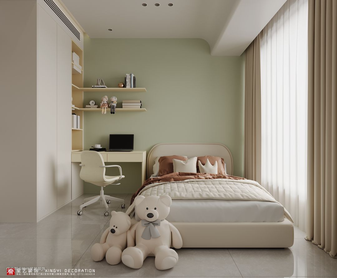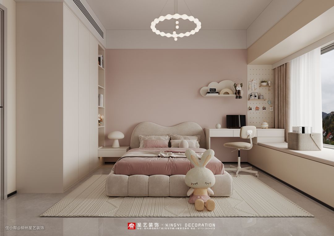 无床腿的软包床充满少女感 层次分隔明显 舒适性如软糯的榻榻米般 低饱和度的艺术涂料 添入温馨舒适 半落地窗利用自然光线 尽览窗外风景