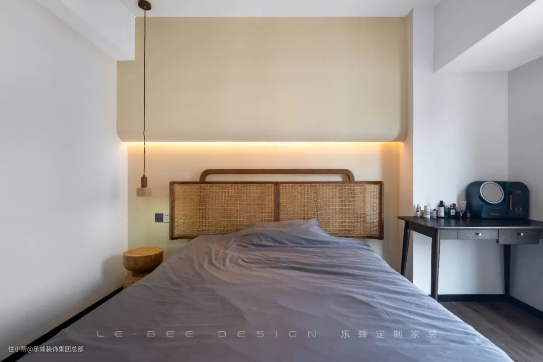 简约的现代风主卧,床头采用具有灵动性与透气感的藤编靠背设计。由于主卧四面都是梁位,设计师从大梁顺着下来做了床头灯槽,床头灯带给足氛围。搭配灰色素雅的床单。卧室落地窗设计,让卧室光线充足的同时也能将室外的景色更好的融入室内。 一边床头摆放天然木头墩,床头柜与原木吊灯互相呼应。另一边黑色极简的梳妆桌,搭配上别具特色的绿色化妆收纳箱,精致又简约。实木材质的温润细腻和藤编镂空的透气感相遇。