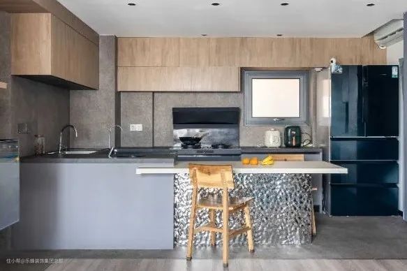 原始的厨房是封闭的、逼仄的,设计师把厨房打开后又把餐桌椅接到了一起。女业主烹饪时不再是一个人了,可以兼顾小朋友也可以和坐在客厅的家人聊天。增加了沟通交流和互动的同时也可以让小朋友了解烹饪享受烹饪的乐趣。