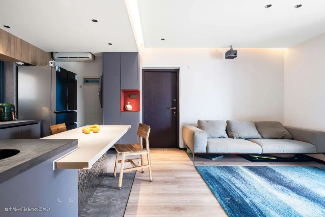 入门即客厅,右边设计的灰色悬空收纳鞋柜。留空放钥匙的地方采用赩炽色搭配再加上花瓶点缀跟暖光照射,同时给大块面的餐厨偷偷带来一丝丝惊喜跟满满的仪式感,伴随早出好心情的延续和晚归一天的疲惫慢慢治愈。 整个客厅的木地板和悬浮吊顶把过道空间纳入其中,让长条形的客厅只停留于平面。进家门映入眼帘的是一排排层板上放着满满的书,业主闲余时间补充能量的同时也能培养小朋友阅读的好习惯。