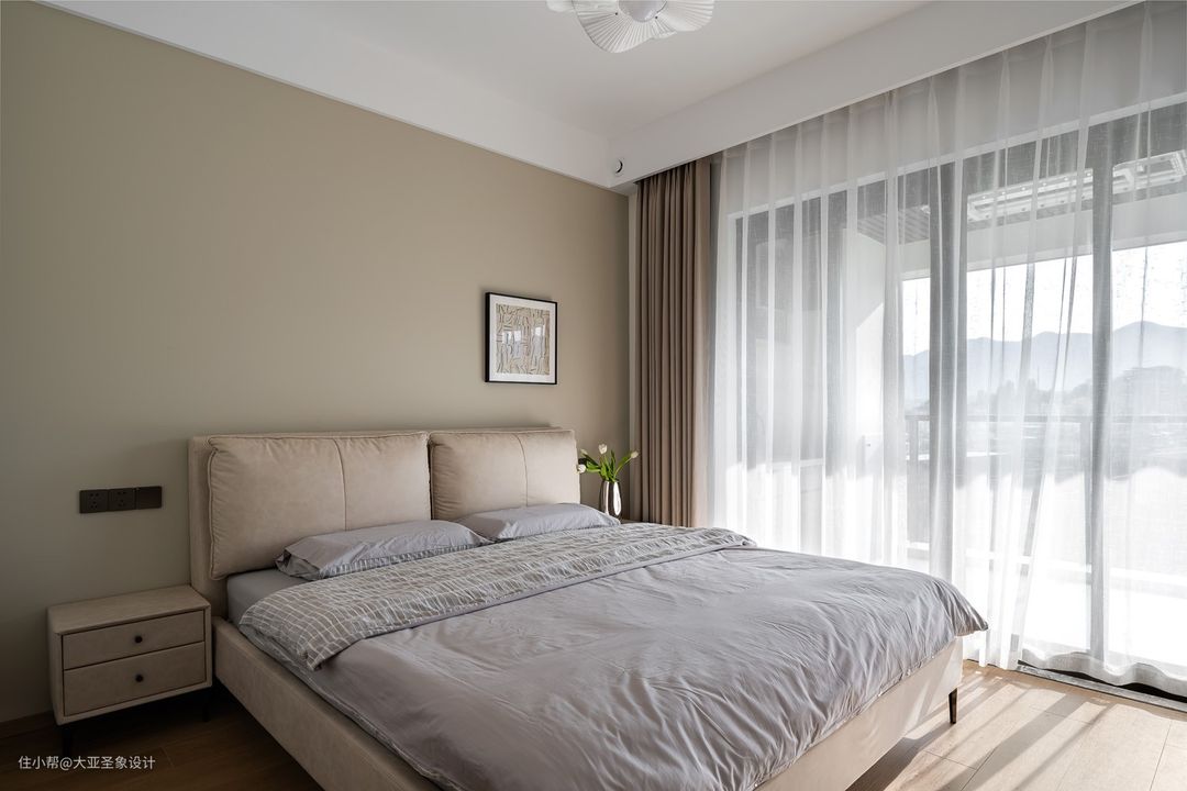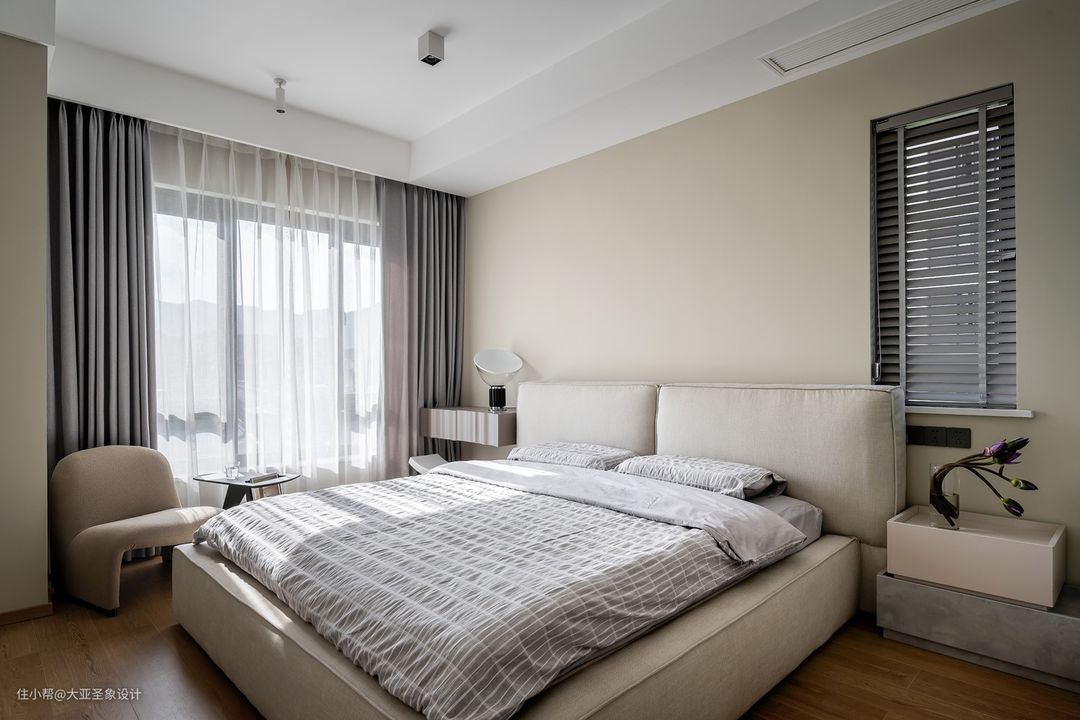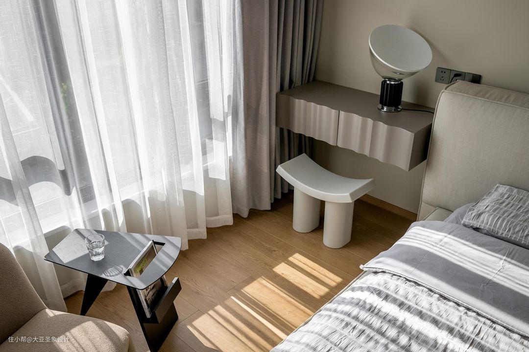 卧室业主是以温馨舒适为主,所以我们为业主选择了丰厚饱满的床,慵懒而舒适,给人很有安全感的味道,悬浮式床头柜和梳妆台是选择了很温馨的奶茶色,当阳光透过窗帘洒进来,整个空间都变得温暖明亮了,就是业主所希望的感觉。