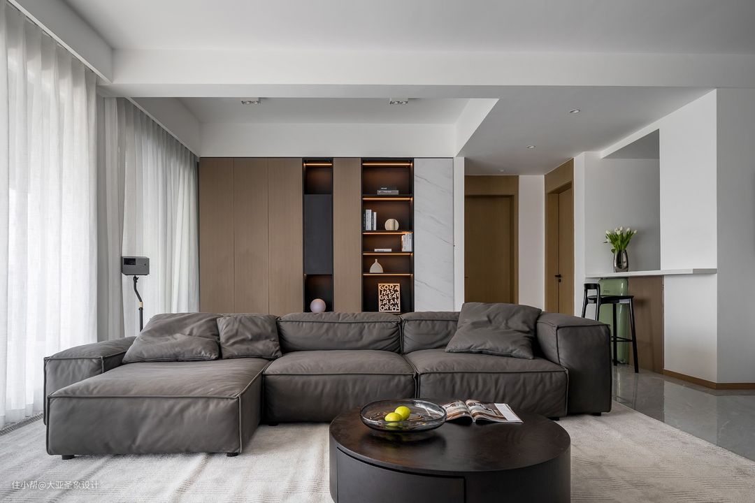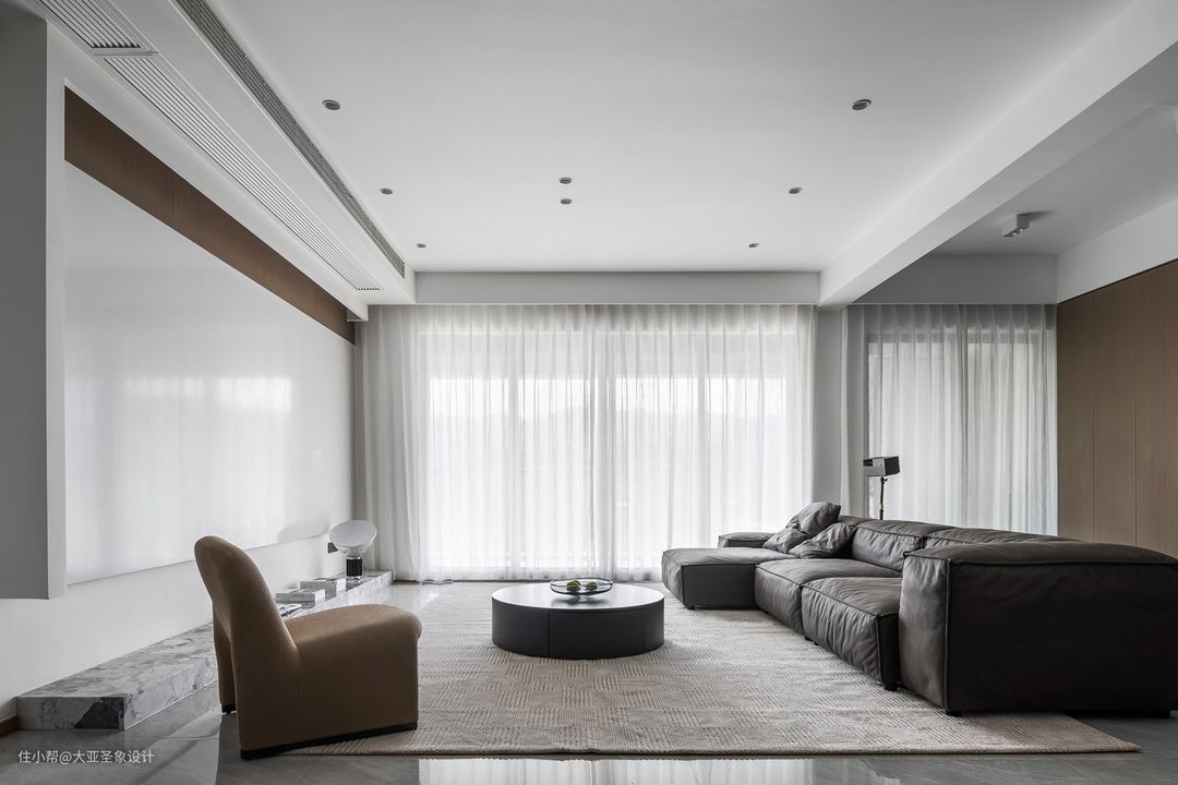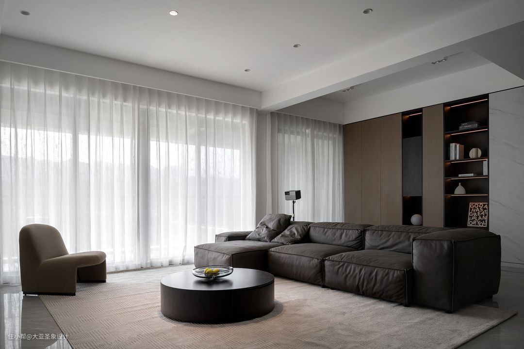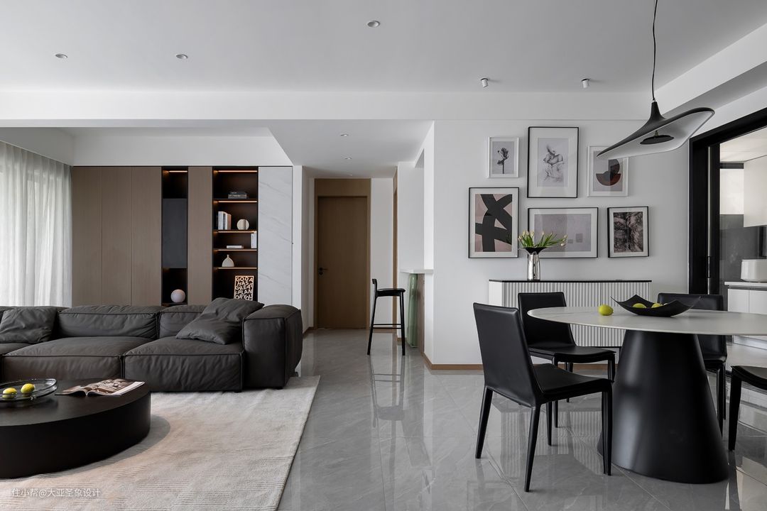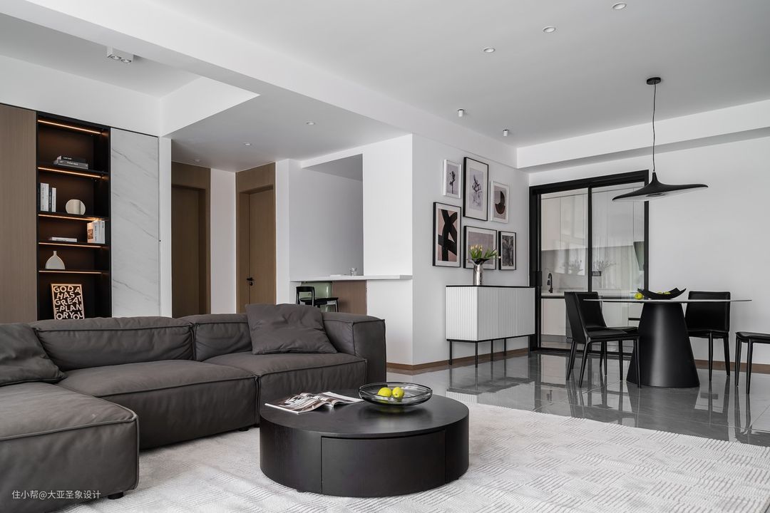 客厅区域我们为业主基本上选的是黑白的经典高级配色,搭配木色柜子,简约中又奢而不华,看似随意的搭配都是精心的设计 。全屋黑皮沙发给人慵懒感,放弃电视柜做地台,沙发背后做顶天立地收纳柜,简洁利落。