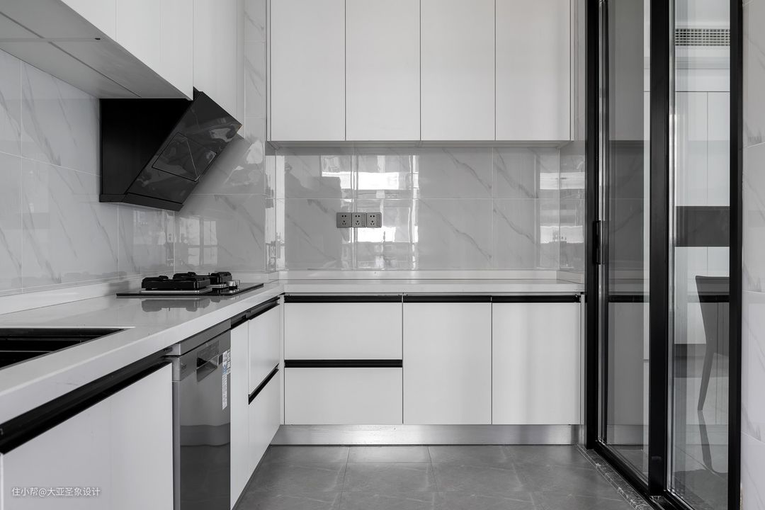 厨房我们用透明玻璃黑边框滑动门分隔厨房和餐厅,这样既能遮挡油烟,也不会造成视觉上的遮挡感,让整个空间看起来更加通透。