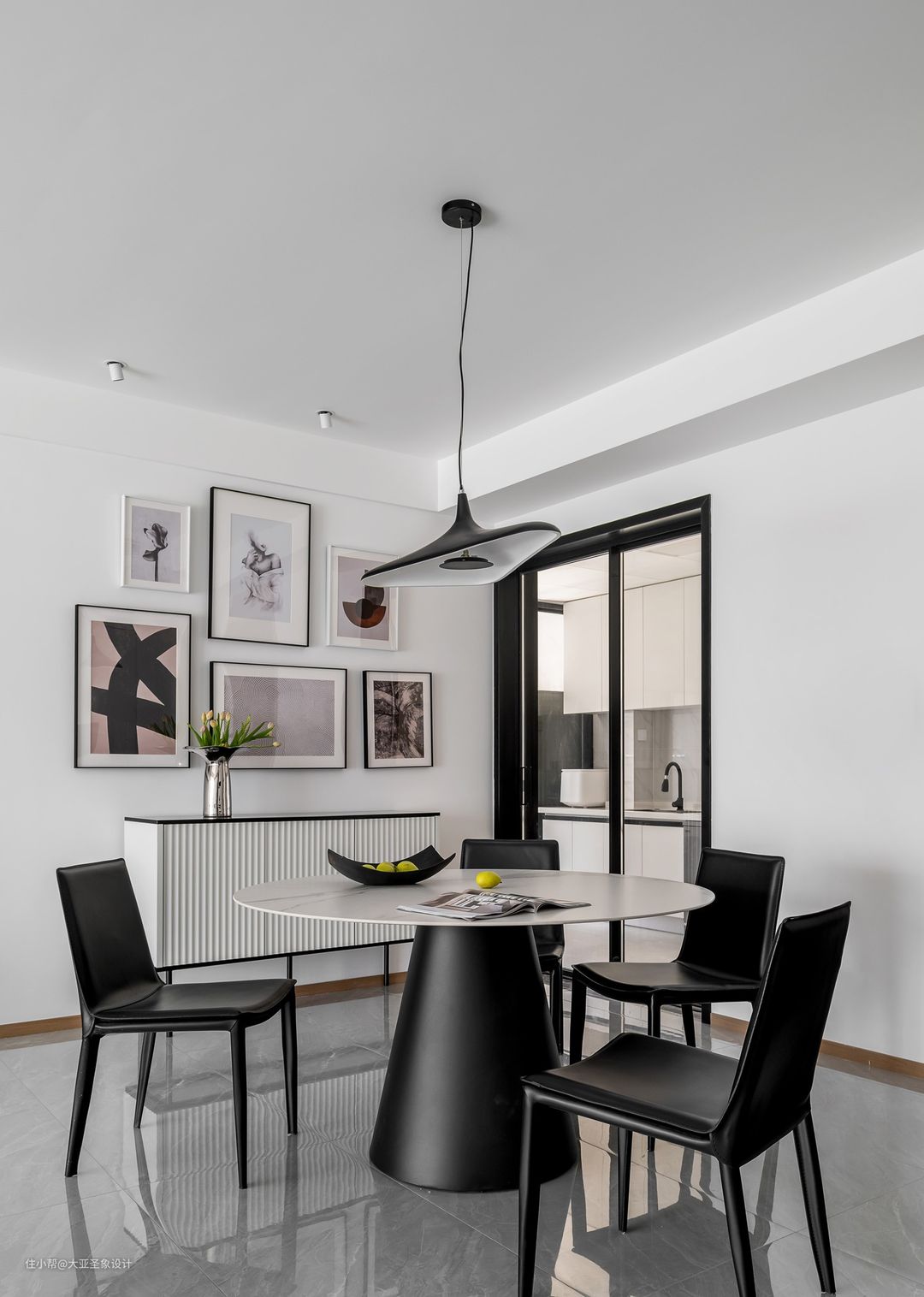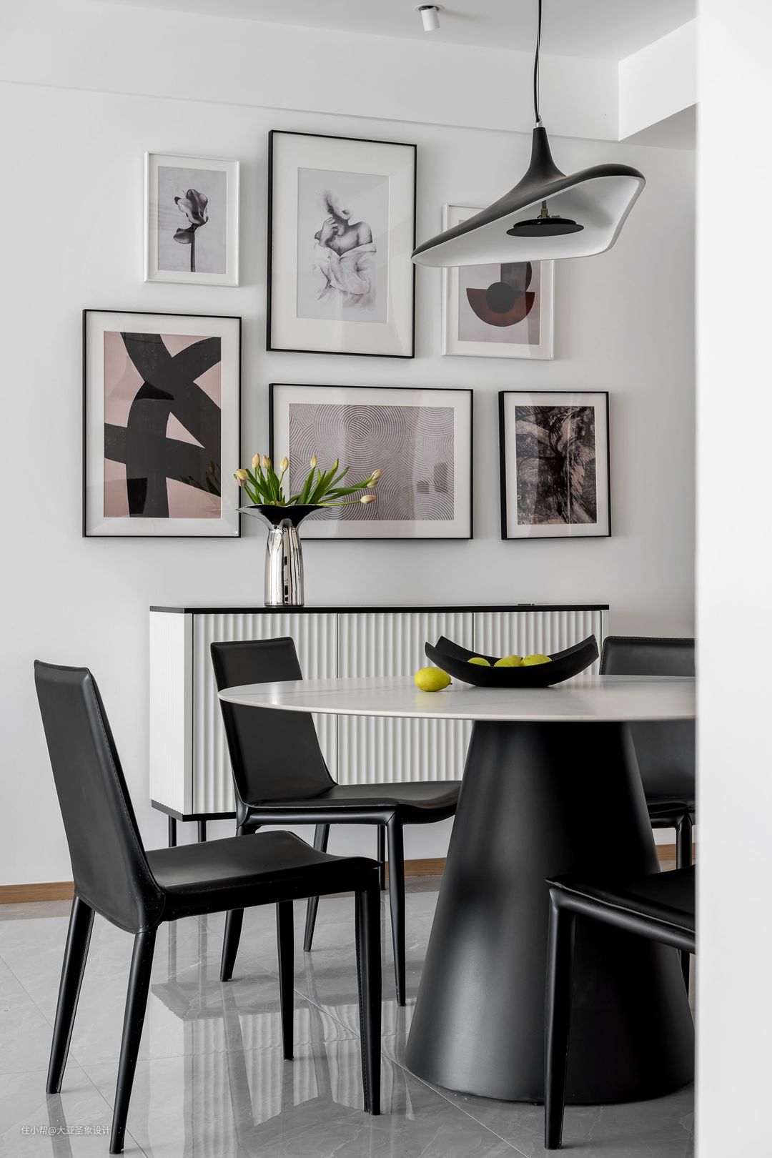 餐厅也是经典的黑白配色,我们为业主选择了百叶褶皱设计的餐边柜加上挂画作装饰,方便又有氛围感。