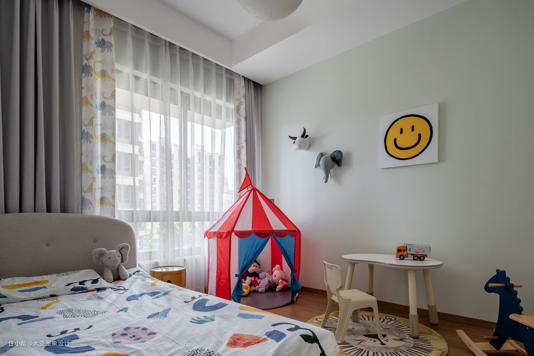 业主有一个小孩,并且现在还小,所以儿童房的布置我们采用了很多充满童真的物品进行装饰和搭配,让孩子可以有一个快乐的玩闹空间。
