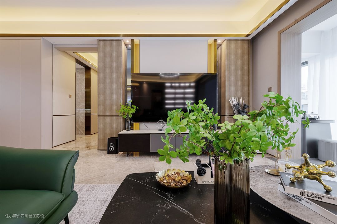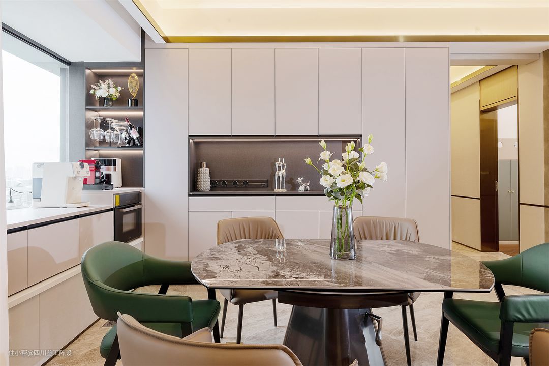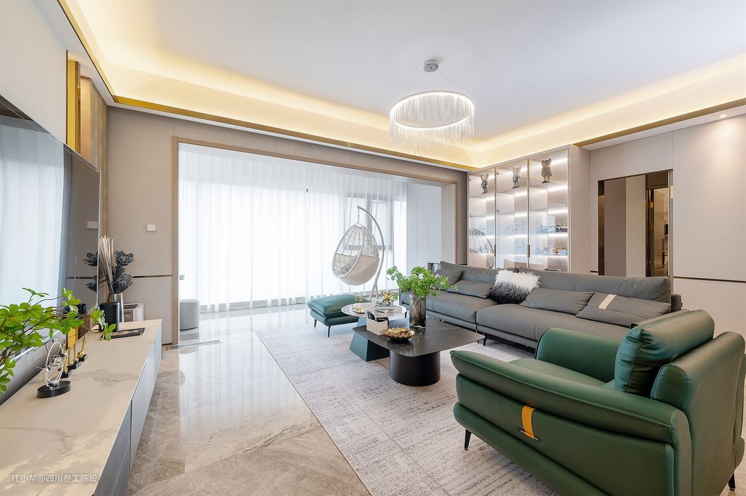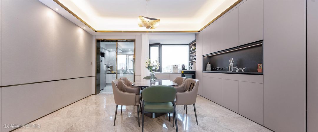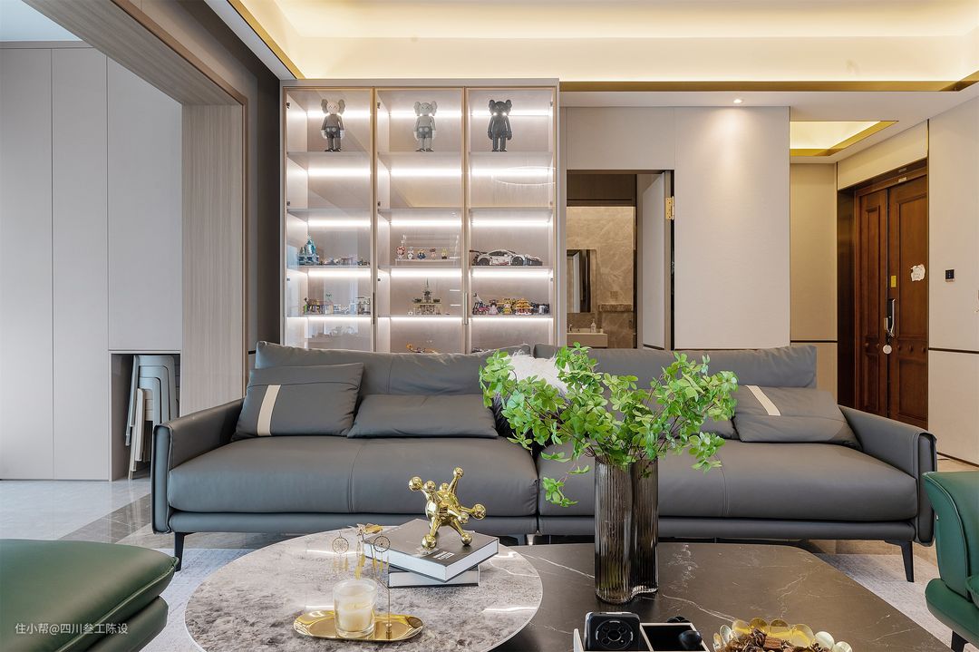 沙发围合式布局,浅灰色地毯上摆放一字型深灰色皮质沙发和橄榄绿沙发椅,触感亲肤,颜色耐脏又方便清洁,柔软舒适的体感彰显生活品质。 茶几是现在常见的组合茶几,但材质上做了细节处理,采用两种不同的岩板,用亮面与哑光,圆形与方形,深色与浅色的对比进行了碰撞和融合,更彰显户主的品味。 沙发后面有房间,户型原因导致没法做沙发墙,但设计师不愿浪费一丝空间,将沙发后的墙面安装了一个顶天立地的定制陈列柜,透明柜门既方便展示有不会落灰。 每格上方都装有灯带和柜门的的金属框相呼应,处处彰显格调和轻奢感,空间显得更加的精致有质感。