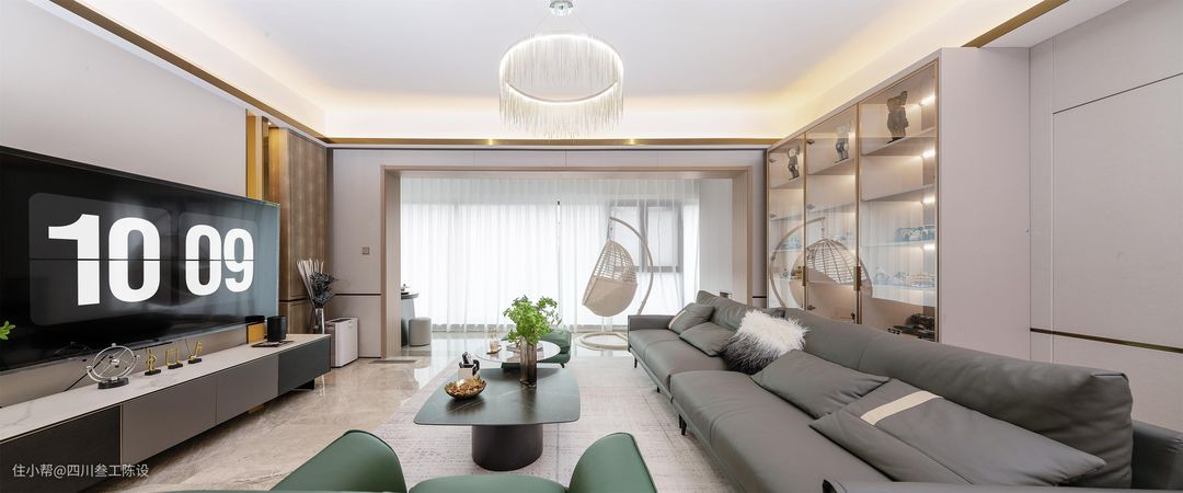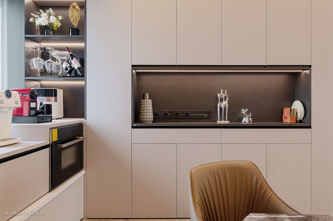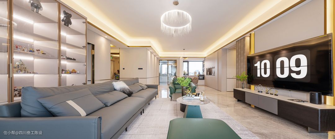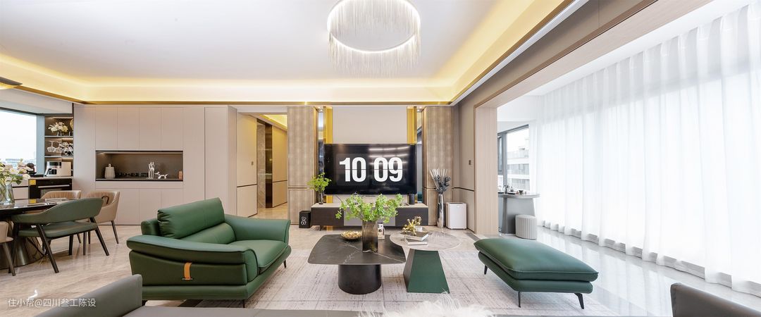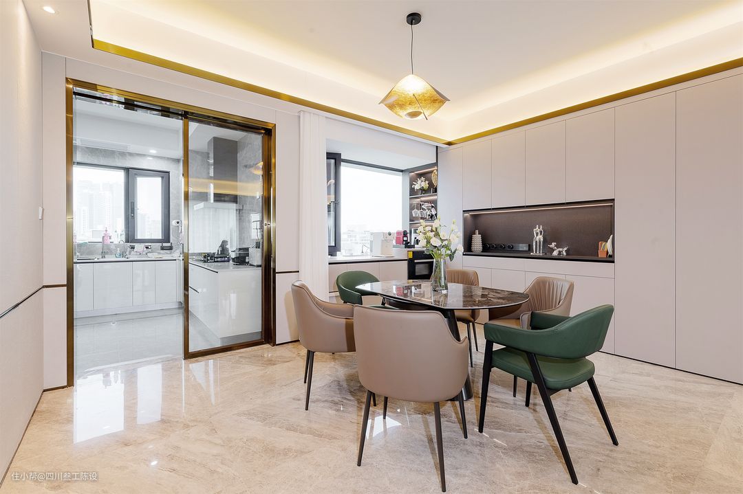 沙发围合式布局,浅灰色地毯上摆放一字型深灰色皮质沙发和橄榄绿沙发椅,触感亲肤,颜色耐脏又方便清洁,柔软舒适的体感彰显生活品质。 茶几是现在常见的组合茶几,但材质上做了细节处理,采用两种不同的岩板,用亮面与哑光,圆形与方形,深色与浅色的对比进行了碰撞和融合,更彰显户主的品味。 沙发后面有房间,户型原因导致没法做沙发墙,但设计师不愿浪费一丝空间,将沙发后的墙面安装了一个顶天立地的定制陈列柜,透明柜门既方便展示有不会落灰。 每格上方都装有灯带和柜门的的金属框相呼应,处处彰显格调和轻奢感,空间显得更加的精致有质感。