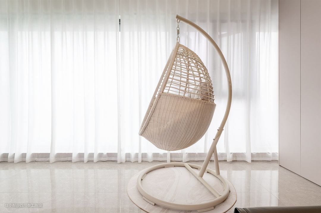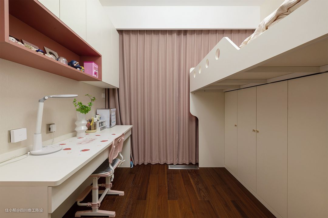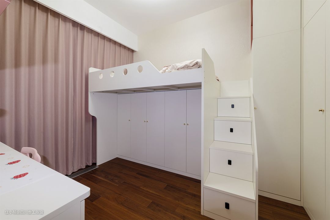女儿房空间不大,设计简约,墙面和家具多使用白色,增加空间的视觉留白度,增加空间通透明亮的感觉,无吊顶的设计加上主灯,将简约进行到底,减少逼仄感。 床面采用高低床设计,考虑到安全性,侧面单独做了一组楼梯,侧面还加了扶手,每格都是一个抽屉,方便收纳,配上黑色拉手,简单又方便开合。 上面的床面同样做了挡板,防止晚上翻身掉落,中间加上圆形镂空增加通透感,床尾的空间也没有浪费,上下都做了收纳柜,上面还做了开放格,方便拿取物品。 设计师将床下的空间利用了起来做了衣柜,白色柜面搭配金属把手,简洁大气,增加空间收纳,为了方便查找,同样做了挂衣区和叠衣区。 房子做的落地窗,粉色的遮光帘点缀空间,上方有窗帘盒遮挡轨道,增加温馨感,少女心十足,考虑到女孩子比较喜欢跳舞,书桌和衣柜中间的位置留的比较多,方便孩子活动。 地面安装深色木板铺贴,耐脏耐用,比较清爽自然,打扫起来也方便,伴随着丝丝木香,也能营造舒适的睡眠环境,增加深度睡眠的时间。 左侧靠墙安装书桌,桌面较长,方便孩子收纳各种摆件物品,下方也有抽屉收纳,椅子的设计符合人体工学设计,久坐不累,不会对孩子的脊柱造成损伤变形。 墙面同样利用起来,安装了配套的吊柜,下面留出了一层摆放区,层次感十足,粉色的柜体和窗帘配套,增加温馨少女感,白色的柜面简洁大方,,明亮有序。