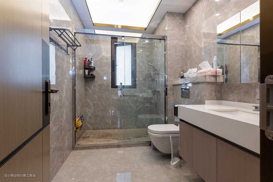 卫生间户型方正,因为层高问题,上面延续卧室的设计做了一个双层吊顶,边缘处加上金属窄条封边,和其他空间的风格衔接。 墙地面都选择了灰色的瓷砖,沉稳大气,比较内敛,洗手台悬空设计,方便打扫,下方柜体收纳,上面的镜柜简洁大方,同样可以收纳一些洗漱用品。 里面安装透明推拉门隔开淋浴间,干湿分离,更有利于便捷生活和洁具的寿命和清洁,地面同样做了防滑设计,增加安全性。