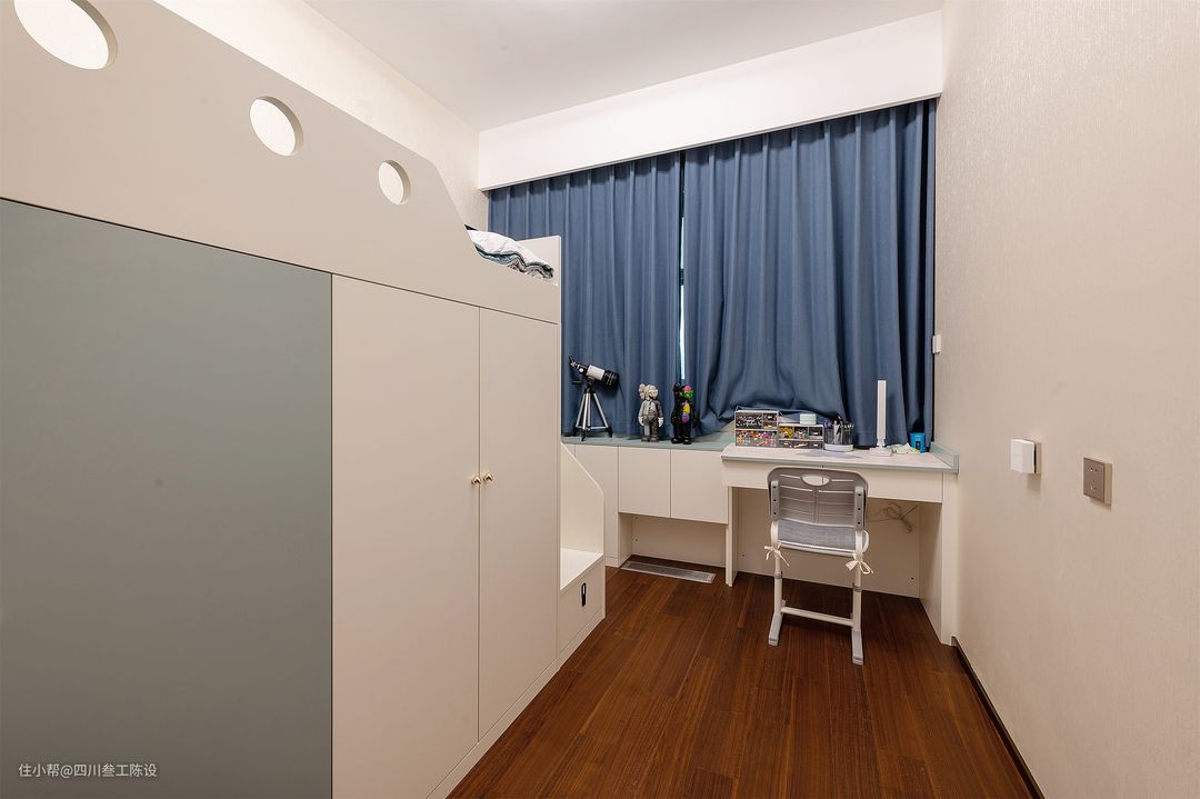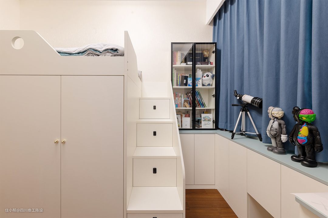 儿子的房间比女儿房小一些,而且还带了一个没法打掉的飘窗,所以设计上虽然也是高低床的设计,但是和女儿房有一定的区别。 经过空间测量后,设计师将飘窗空间改成了一个学习区,孩子喜欢医学,空间劳逸结合,飘窗的台面不仅可以放置书本,还放置了孩子的益智类玩具。 吊顶和灯光沿用女儿房的设计,简洁的吊顶做边吊隐藏窗帘轨道,遮光帘从一片式换成了两片的半窗帘,颜色也是更加宁静舒缓的蓝色窗帘。 墙面没有全部留白,床对面的墙体贴上了米色的墙布,比起白墙更加耐脏耐磨,黑色踢脚线保护墙面,空间的设计虽然多了一些点缀但并不会显得杂乱。 上床的设计和女儿房,没有太大差别,下面的柜面用清爽的绿色和简洁的白色拼接设计,金属把手方便开合,里面柜体进深长,能够收纳更多物品。 飘窗下的空间同样安装了定制柜,柜面做无把手设计,更加简单大气,靠墙的位置上面还装了一个收纳柜,透明柜门方便查找物品,也增加了空间的美观性。 侧面的阶梯安全性更高,每层都是一个抽屉满足收纳,侧面安装扶手,双重保障。墙面留白和床融为一体,美观性和整体性更强。