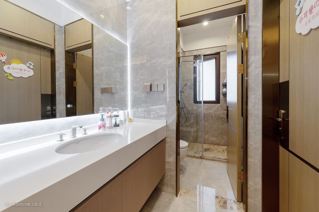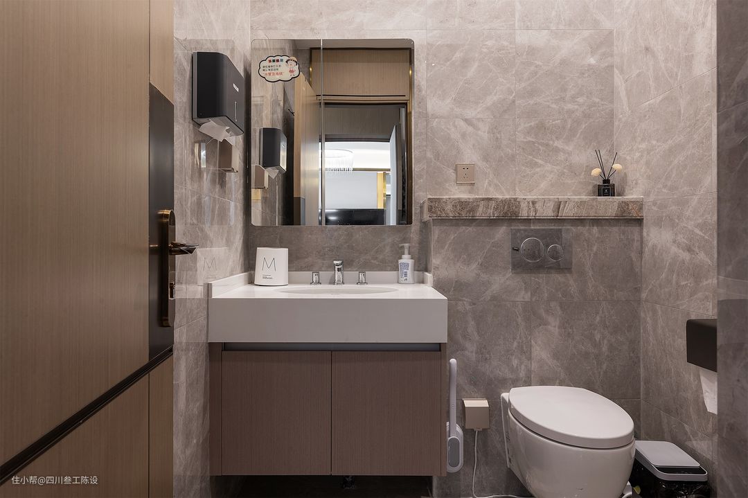 公卫的整个户型是比较狭长的,设计师选择将洗手台外置,不仅干湿分离,还方便了一家人的日常使用,适当的金属元素点缀,突出了空间的质感。 洗手台面积虽然不小,但没有做双台盆,留出大量的放置区,便于摆放户主的化妆品和护肤品,z超大镜面搭配灯带,光线明亮,现代感十足。 墙面用灰色砖,地面是米色,更符合空间整体色调,墙地面区分,里面的淋浴间安装推拉门单独隔开,为了安全性,地面还做了防滑处理。 另外一个卫生间面积狭小,和户主交涉后决定舍弃淋浴空间,只做洗手台和马桶,方便上厕所和洗漱,洗澡在房内或另一个卫生间洗。 洗手台靠墙安装,同样的悬浮式设计方便扫地机器人出入,灰色墙地面和木质柜适配度很高,上方的镜柜做隐藏收纳,可以收纳一些洗漱用品。 侧面马桶区的墙面凸出,隐藏管道,空间更加美观,上面的台面宽度不大,但放香薰已经足够,同时设计师还装了插座,方便电器的使用。