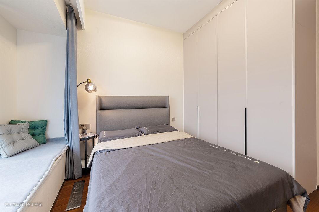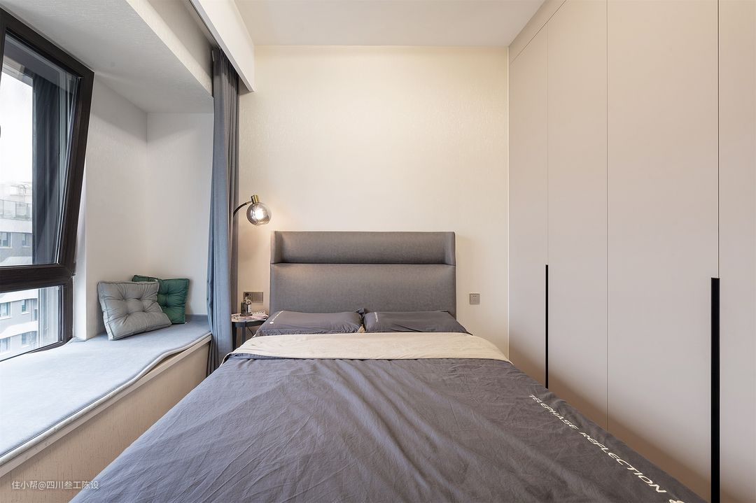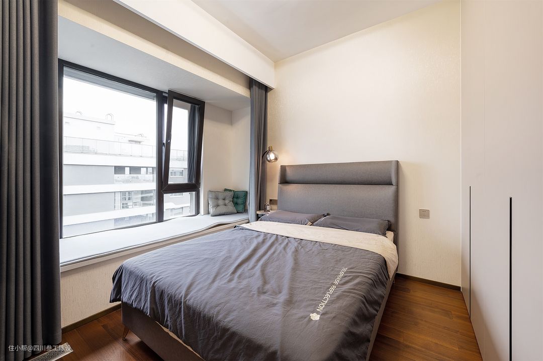 次卧是给老人住的,房间以简洁和沉稳为主,颜色选择现代风经典色调,灰色床面成熟稳重,造型也颇为大气,搭配床头柜,营造出舒适的睡眠环境。 吊顶做平吊设计,空间显得更加简洁大气,侧面安装窗帘盒隐藏轨道,美化空间,与床面同色的灰色窗帘,让空间更加融合和谐。 飘窗铺上了软垫,方便平时做一个休闲区,墙面留白,不做复杂的装饰,左侧小巧的茶几便于放物和装饰空间。 侧面是到顶的衣柜收纳,外观大气内敛,为了方便开合侧面没有安装床头柜,且柜门上做了一个内扣把手。