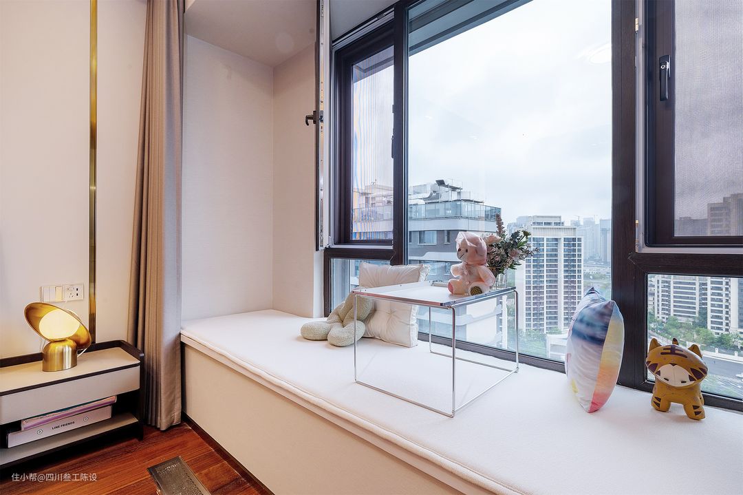 装修后将客厅的阳台打通通铺,封窗安装了落地窗增加视野和采光,客餐厅显得更加明亮通透,灯光上也运用巧思,增加了空间的光照和氛围。 儿童房则是做了独立的房间,考虑到既要衣柜和舒适的居住环境,又要学习区,因此设计师做了整屋定制,增加了收纳空间。