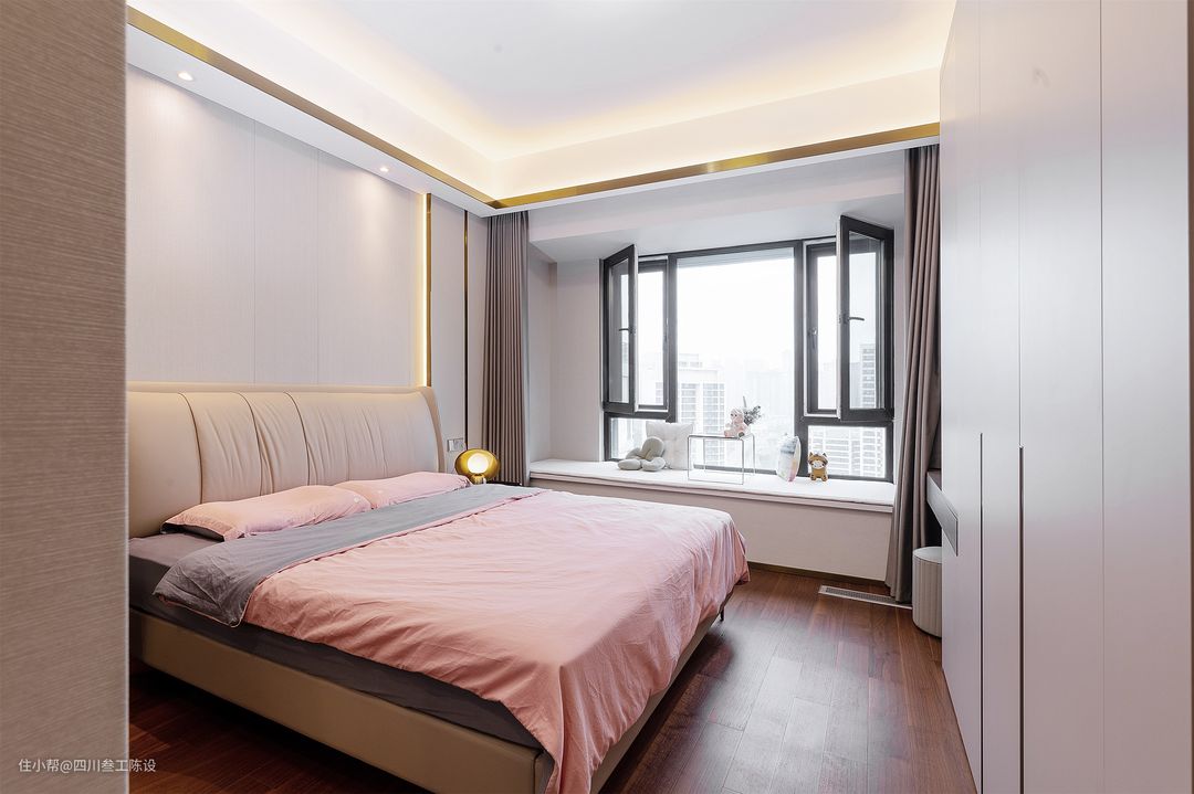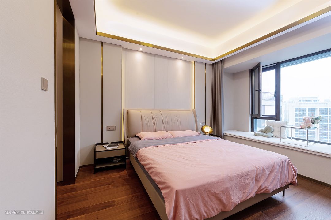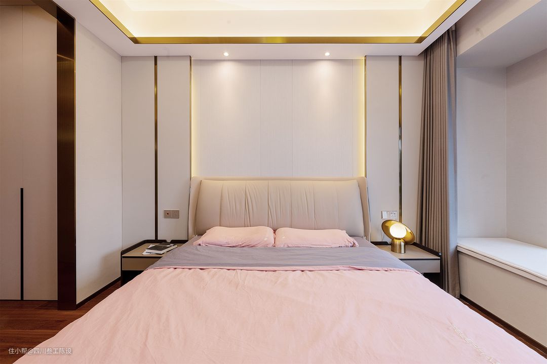 米色的床头软包以及粉色的床面为空间营造了一种轻松温馨的氛围,床头软包和床头背景墙的双重隔音,能给户主带来更加舒适的睡眠环境。 两侧床头柜都做了悬空设计,方便扫地机器人出入打扫,方正的造型和简洁设计显得空间更加大气,侧面是卫生间,同样做了金属门套装饰,走廊两侧安装了到顶衣柜,不放过任何可以利用的空间。 设计师将飘窗空间利用起来做了一个小茶室,铺上软垫,放上精致的小茶几,简洁大气,方便夫妻两人平时谈心聊天,周围的娃娃摆件增加趣味性和温馨感。
