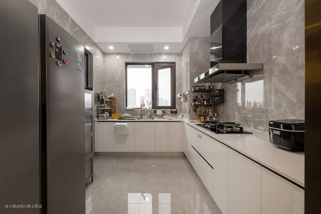 厨房安装吊轨门,节省空间,动线流畅,透明推拉门也能让厨房的光照到餐厅,增加通透感,金属元素更能增加现代感和轻奢质感。 整体安装L型橱柜,增加空间的收纳,上面的操作台合理分区,方便使用,柜子用的内扣把手,方便柜子的开合,电器做嵌入式设计。 吊顶下方装有筒灯增加采光,墙地面铺贴同款灰色瓷砖,考虑到空间的采光和面积,安装吊柜会显得比较压抑,因此没有做柜子,只有顶吸式油烟机裸露在外面。