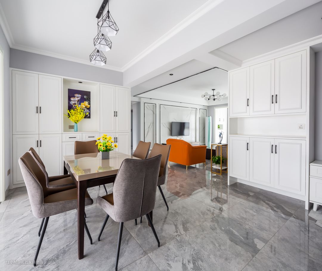 设计师经过改造,让出部分餐厅面积做了整面墙的餐边柜,起到收纳储藏的作用。整体看起来也非常的和谐。