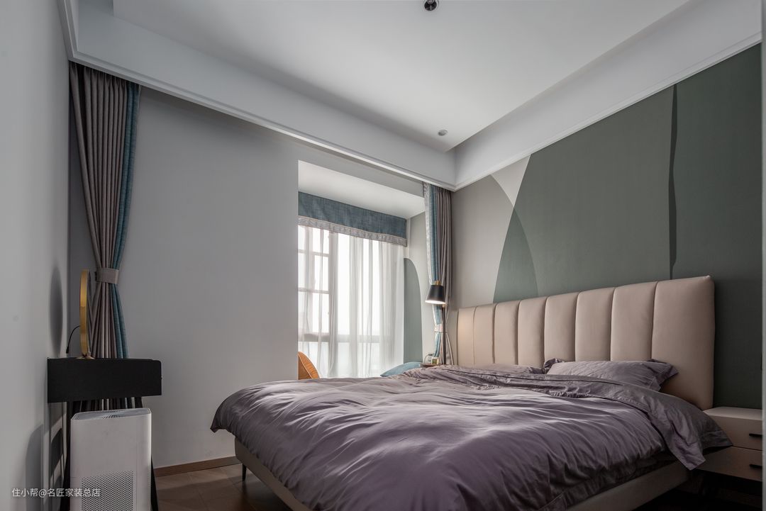 卧室的颜色干净明亮,整体设计相当的柔和,略带欧风的大床,同色系的床头柜和梳妆台,米白色的树叶灯具,搭配墙面淡淡的灰色,让睡眠空间静谥温柔。