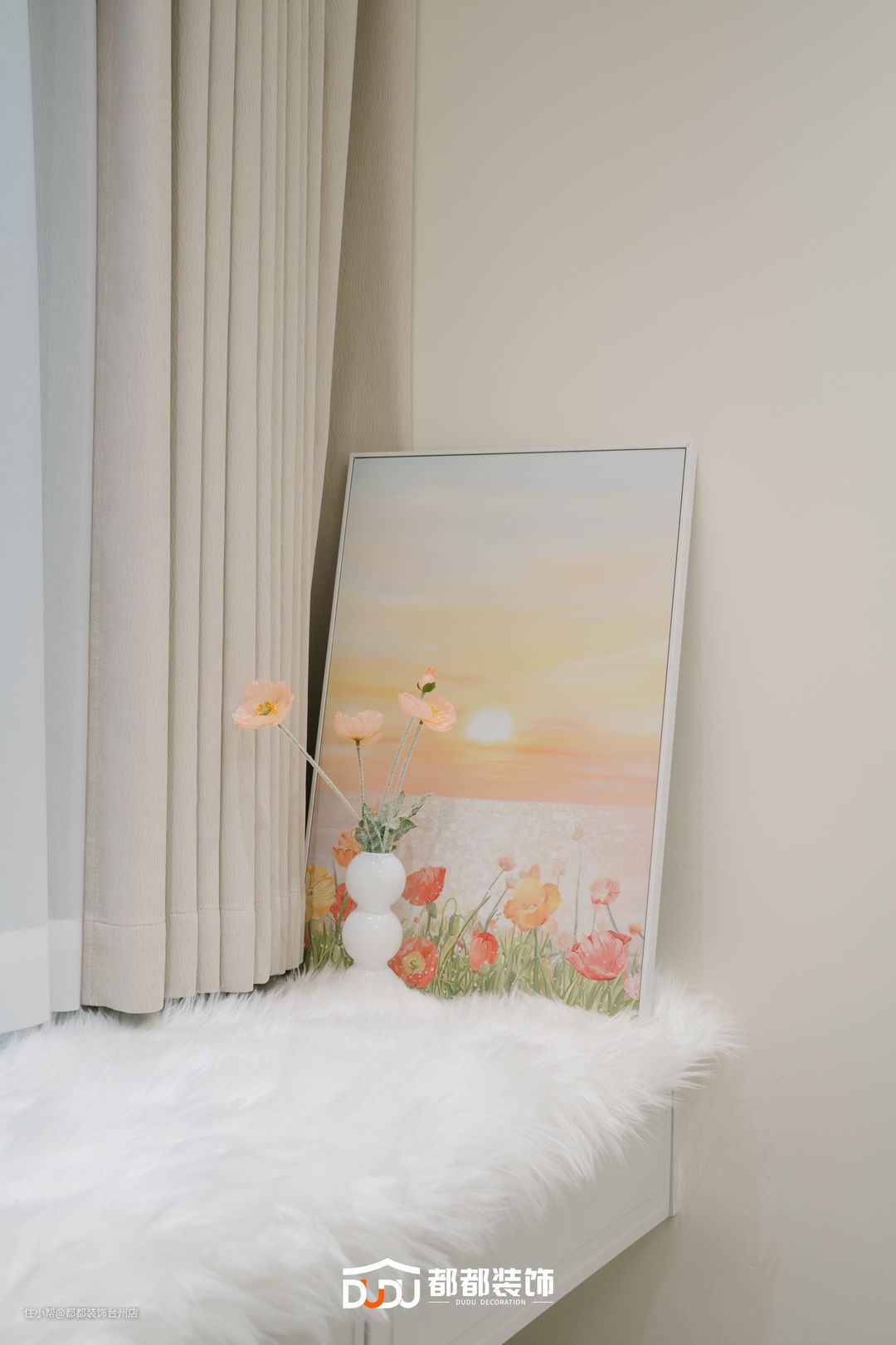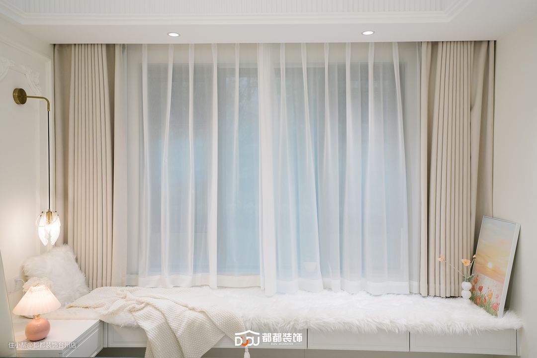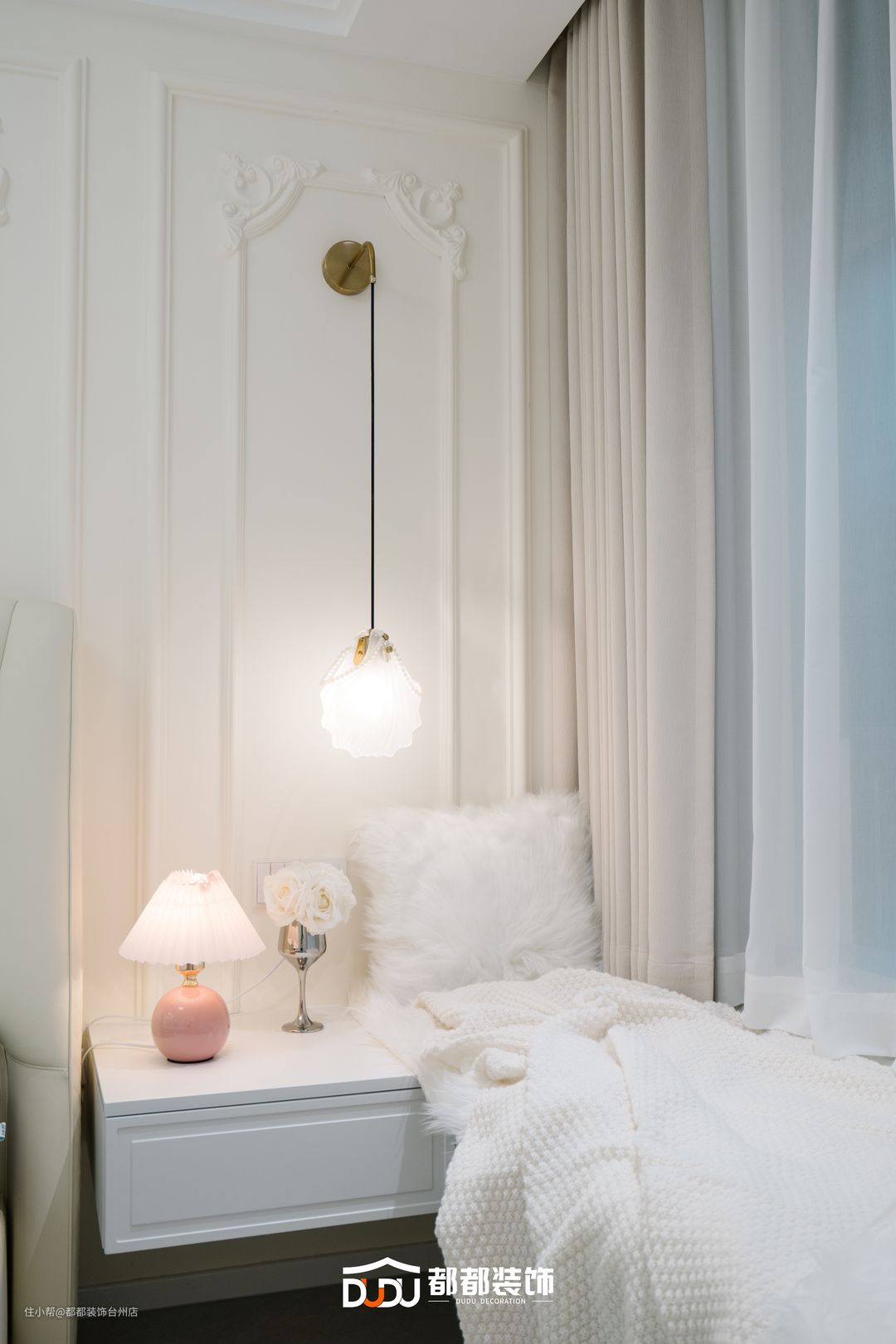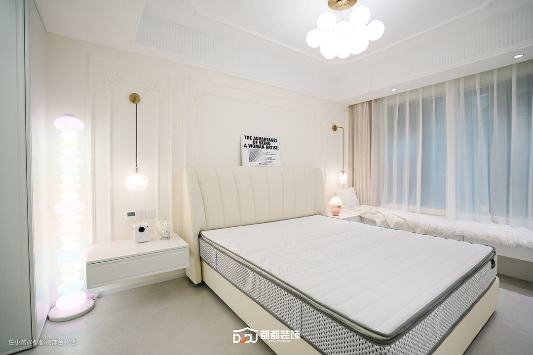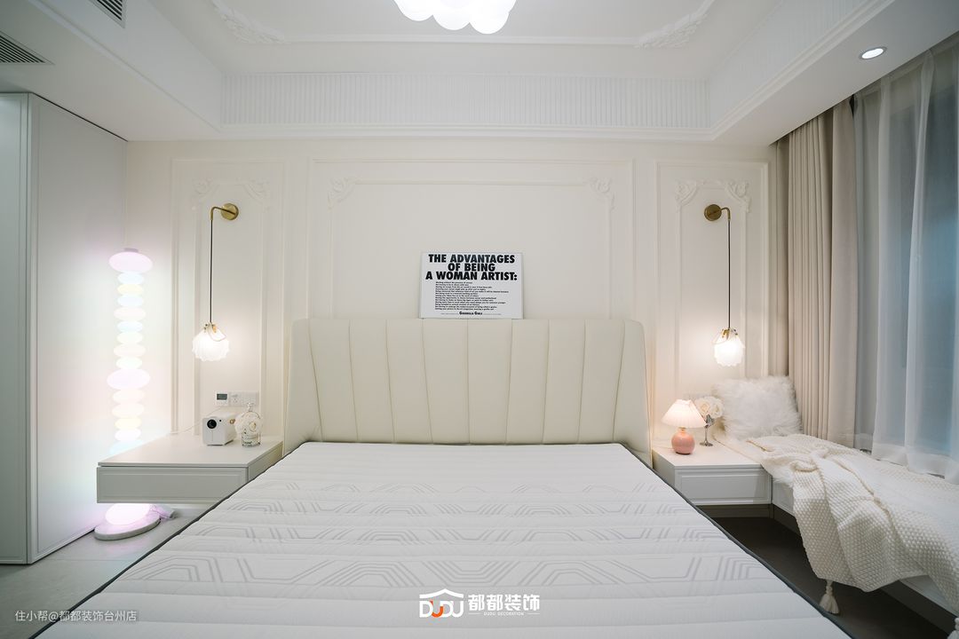 主卧延续了法式的纯粹,双眼皮吊顶与石膏线的结合,令空间简约不失层次感,弥漫着优雅的气息。没有过多的色彩和修饰,仅在床头放了一个水晶玻璃造型的落地灯,在夜晚点亮空间,少而精的元素让卧室拥有设计感的同时兼具舒适性。 飘窗铺上飘窗垫,放上小毛毯,沐浴着暖煦阳光、感受着清爽微风,嘬茶赏景、畅游书海、听乐观影,或就这么慵懒的躺上一躺,将心绪放空,漫享偷得浮生半日闲的自在,给自己一份清闲安静的松弛感。