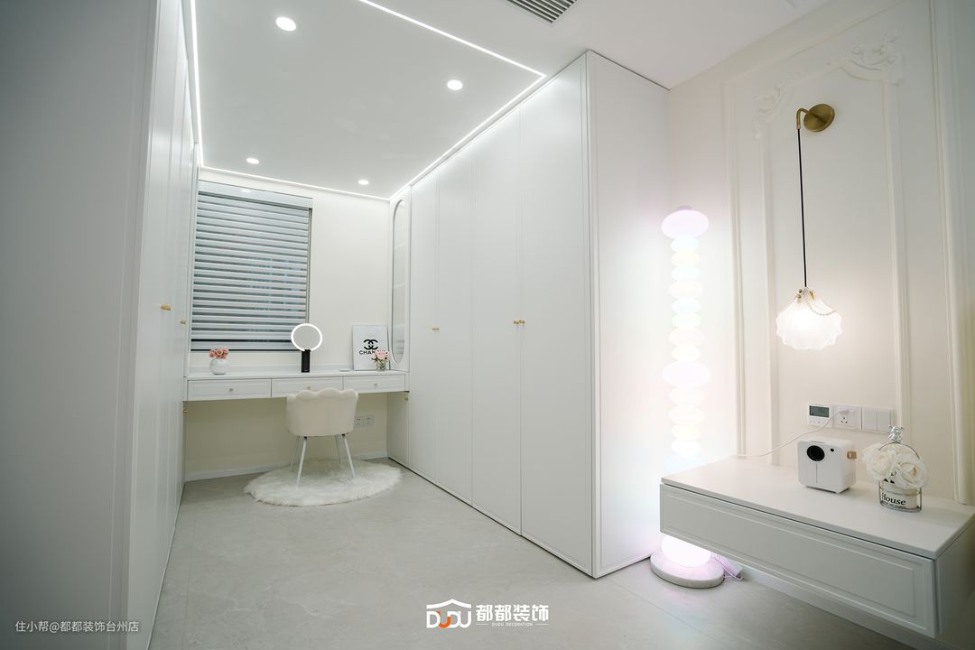 把最小房间的墙拆了,做了一个步入式衣帽间包进卧室,让进入卧室衣帽间这件事变得很有仪式感。整体延续简洁干净奶白的风格,搭配毛绒小巧软座椅并且打造悬浮桌,空间散发静谧舒缓氛围。 双开门玻璃衣柜设计,破开整柜的压抑,明亮灯带的加入,带来更多的精致感。梳妆台上方的天花板同样预埋灯带,淡化大白墙的冰冷感。