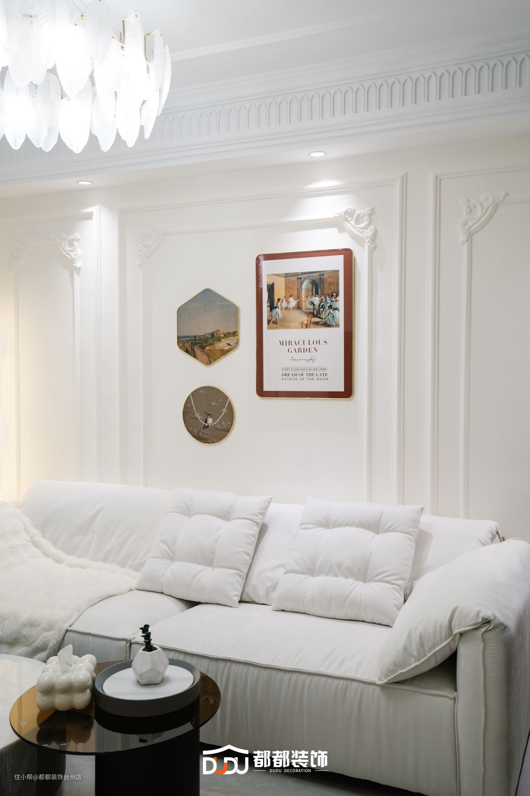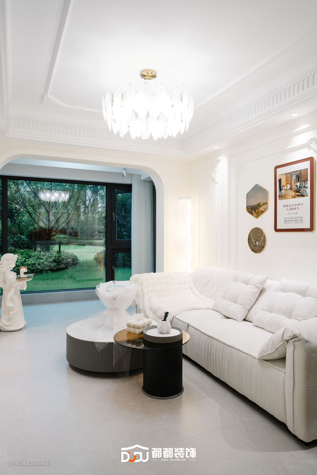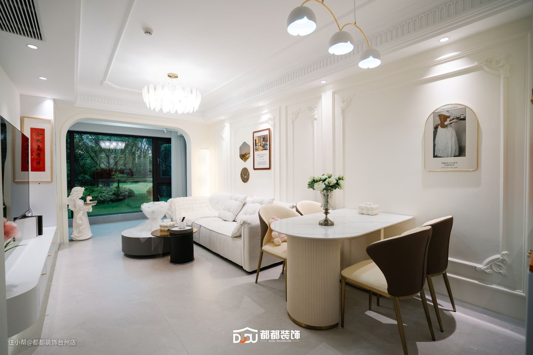 客厅以简洁温暖的白色铺垫,通铺柔光砖干净又显大,背景墙使用细腻的石膏线雕花装饰,切合了法式对称美学、雕花精妙、线条优美的特点;治愈奶油白依附着柔和的几何弧线,将法式风的浪漫与现代空间的简约融合,调和出客厅优雅简练的底色。 奶白色沙发尽显柔情与高级,进入客厅的那一刻开始,就仿佛跌入大团的云朵里,身心都变得治愈平和。当法式遇上奶油风,再融合多种现代元素,不失法式浪漫的同时,又如同与松软绵密的榛子奶油蛋糕撞了个满怀,治愈温馨触手可及。 弧度优美的拱形门洞建立起客厅与阳台流畅联动,大尺度落地窗,保证室内的明亮通透,圆弧造型的拱形门与石膏线条的结合,让硬装也能营造烂漫的装饰效果。一袭洁白的梦幻帘,将客厅所需的光照,调和至舒适的明度,阳光正好,微风不燥,岁月静好。 天使爱丽丝托盘雕像高级又精致,让人眼前一亮;整个客厅法式奶油风格弥漫着复古、自然主义的基调,不禁让人奔赴一场充满浓郁的艺术气息的“童话屋”。