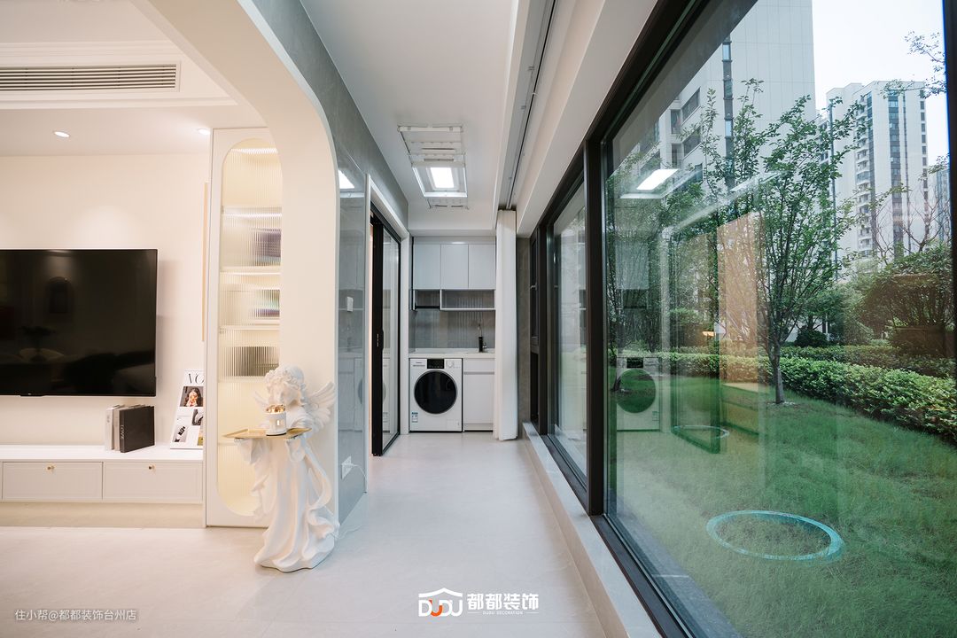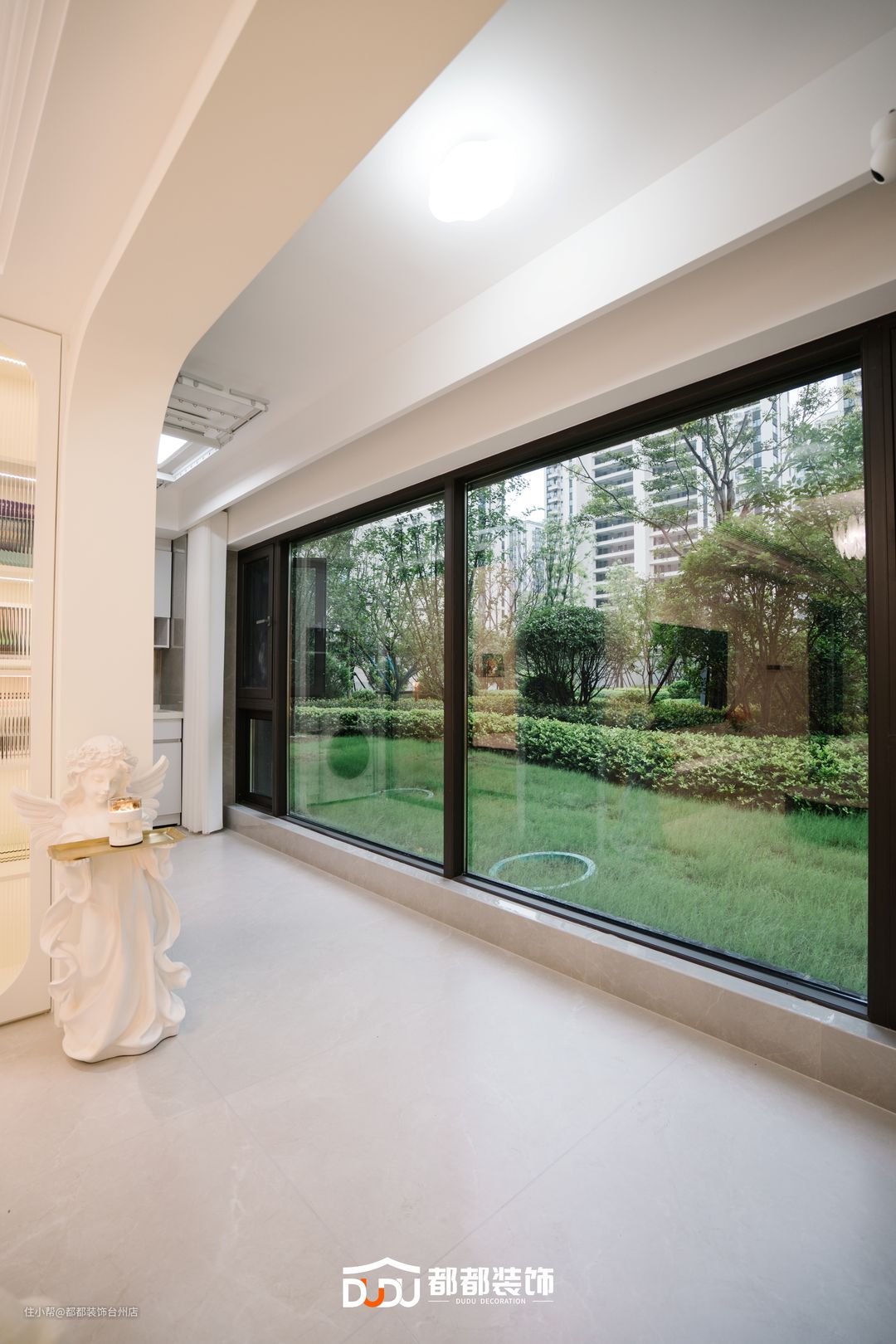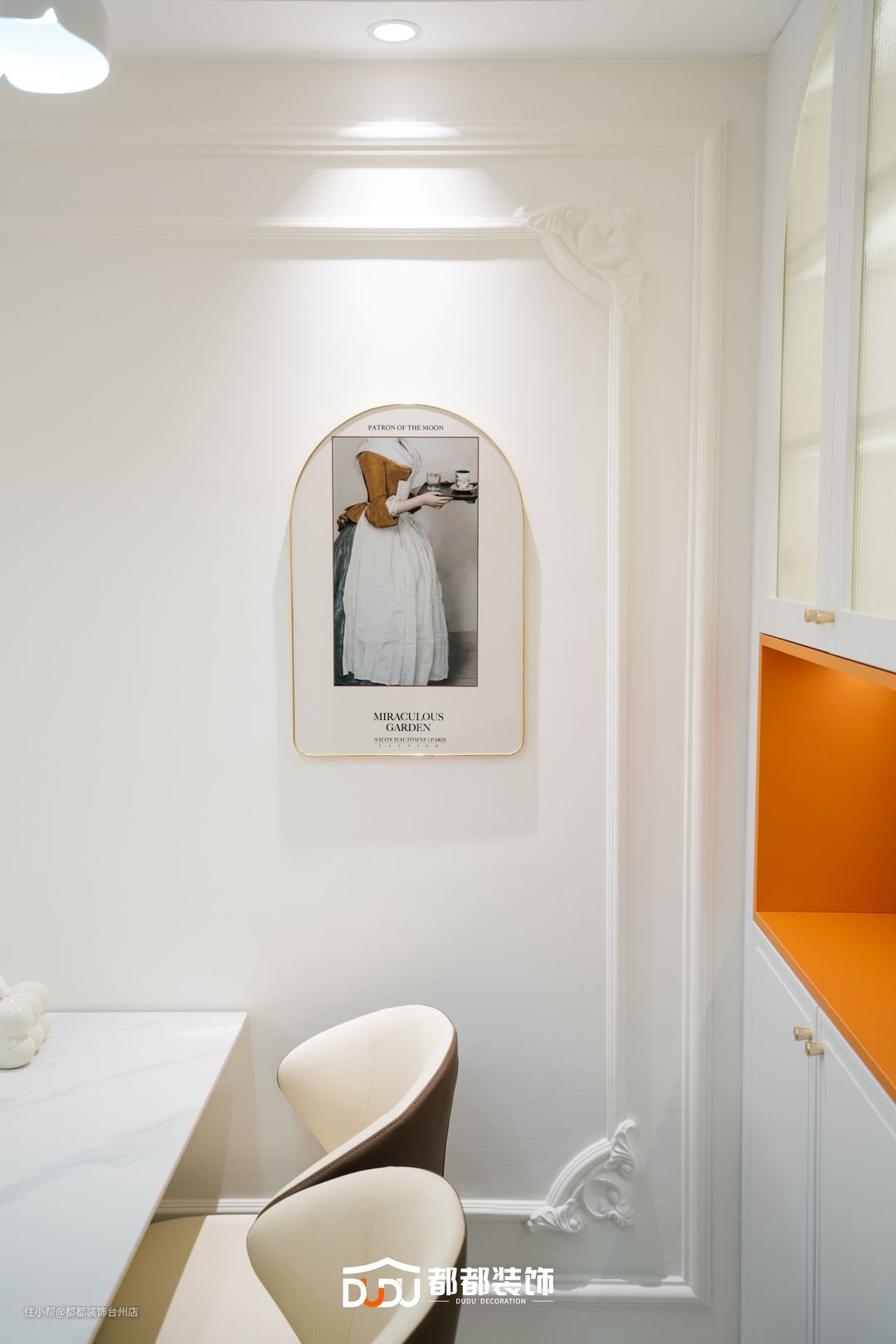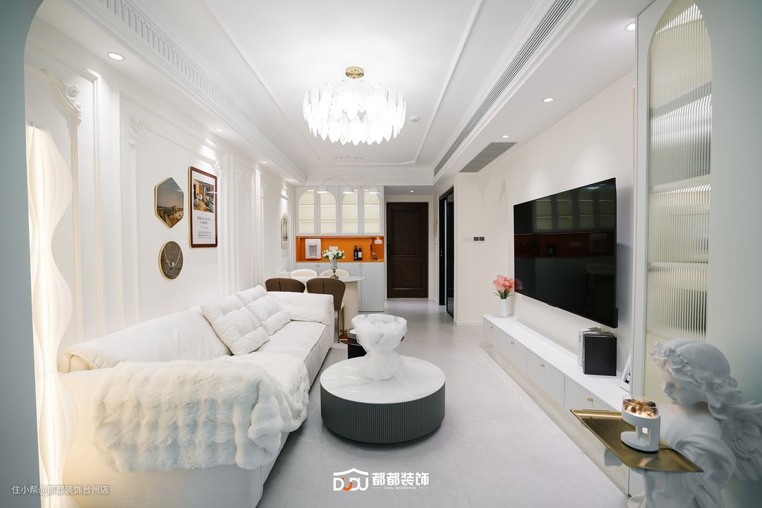 客厅以简洁温暖的白色铺垫,通铺柔光砖干净又显大,背景墙使用细腻的石膏线雕花装饰,切合了法式对称美学、雕花精妙、线条优美的特点;治愈奶油白依附着柔和的几何弧线,将法式风的浪漫与现代空间的简约融合,调和出客厅优雅简练的底色。 奶白色沙发尽显柔情与高级,进入客厅的那一刻开始,就仿佛跌入大团的云朵里,身心都变得治愈平和。当法式遇上奶油风,再融合多种现代元素,不失法式浪漫的同时,又如同与松软绵密的榛子奶油蛋糕撞了个满怀,治愈温馨触手可及。 弧度优美的拱形门洞建立起客厅与阳台流畅联动,大尺度落地窗,保证室内的明亮通透,圆弧造型的拱形门与石膏线条的结合,让硬装也能营造烂漫的装饰效果。一袭洁白的梦幻帘,将客厅所需的光照,调和至舒适的明度,阳光正好,微风不燥,岁月静好。 天使爱丽丝托盘雕像高级又精致,让人眼前一亮;整个客厅法式奶油风格弥漫着复古、自然主义的基调,不禁让人奔赴一场充满浓郁的艺术气息的“童话屋”。