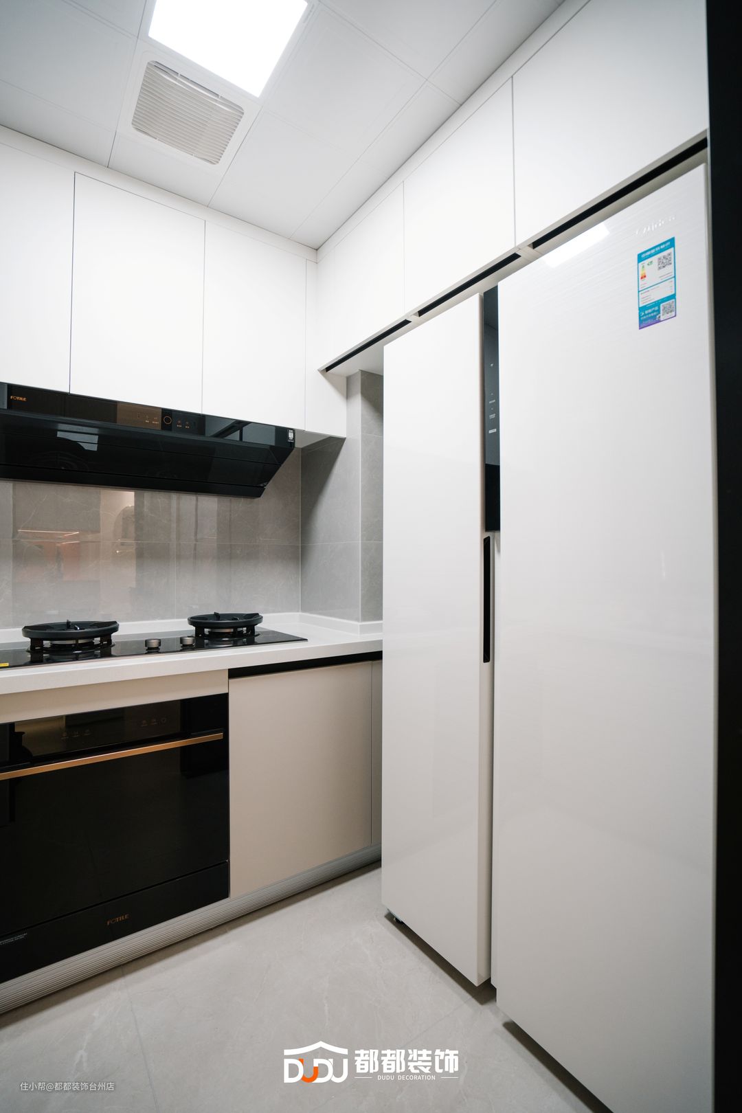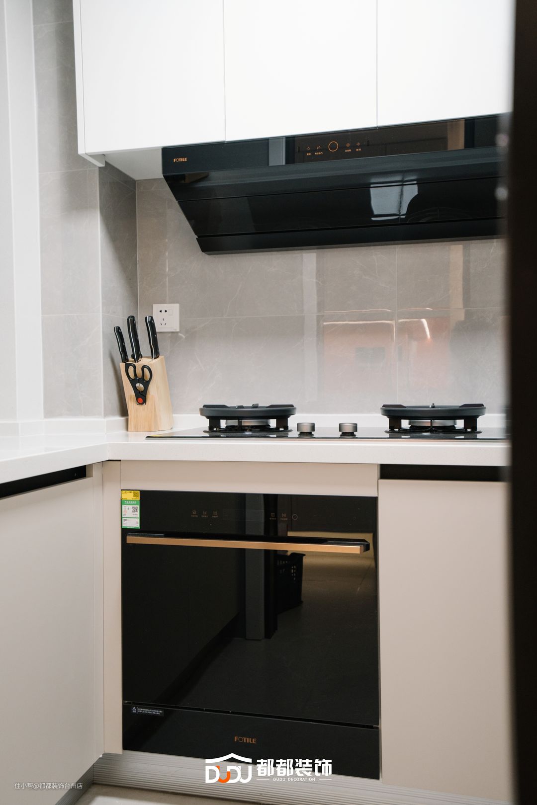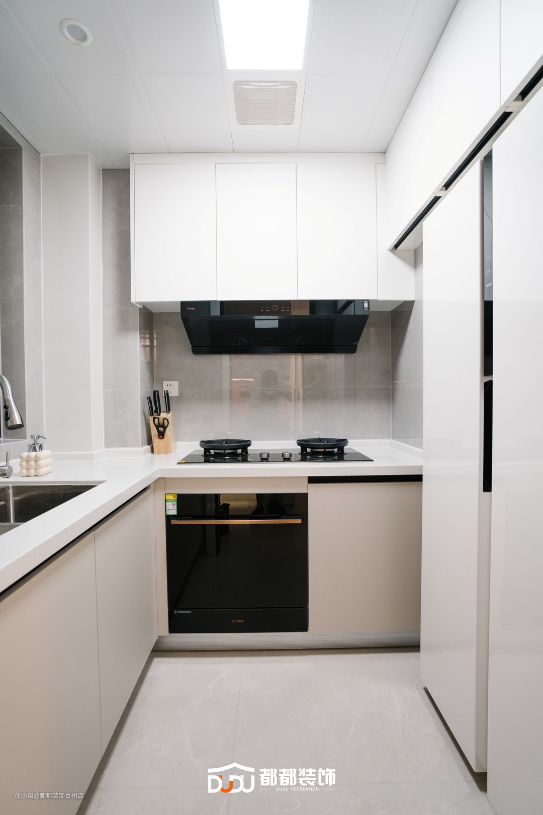 厨房遵循L型动线布居,高效便捷,大单槽、嵌入式洗碗机一应俱全,白色哑光橱柜与地砖相映衬,吊顶植入灯带,备菜无惧背光烦恼。