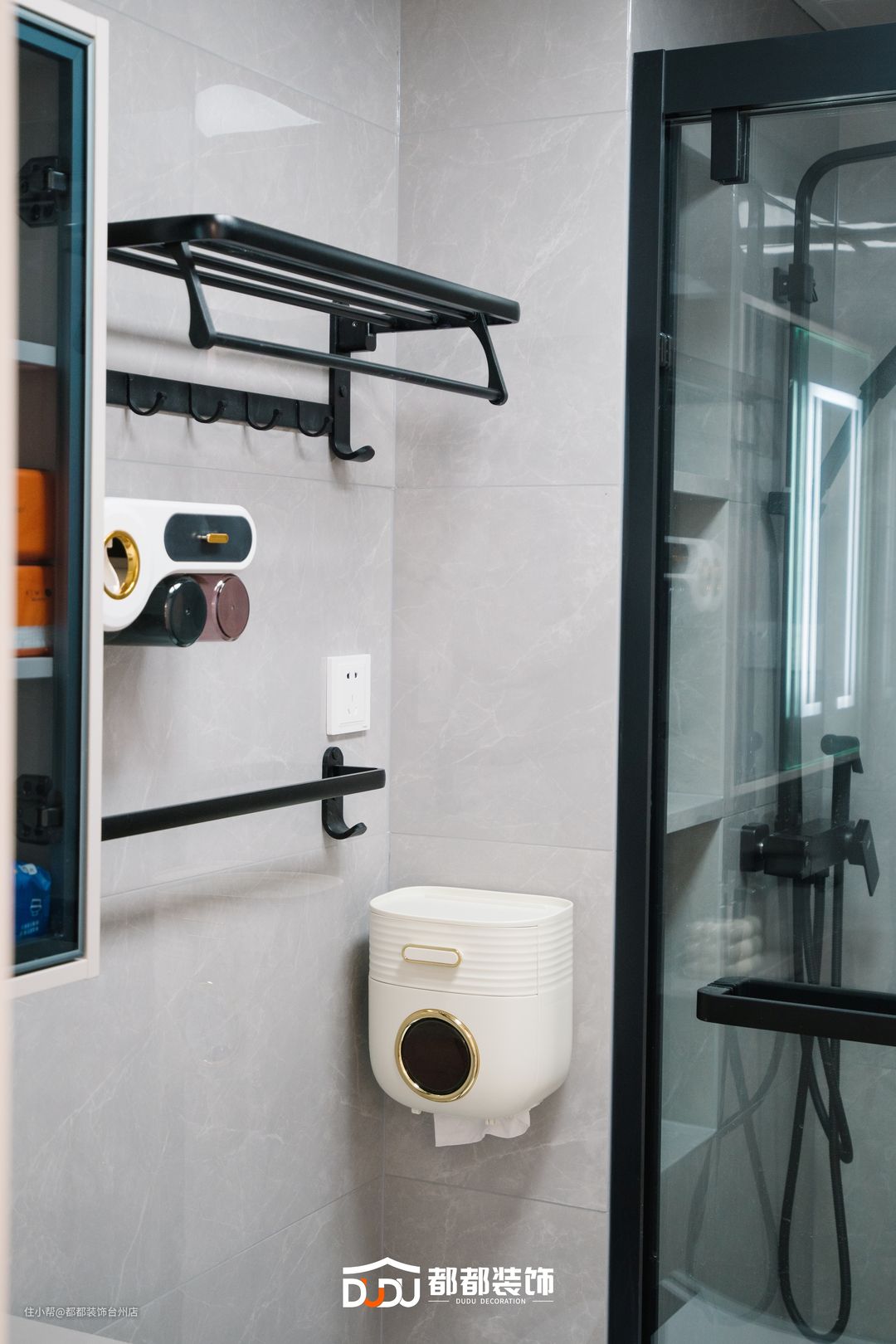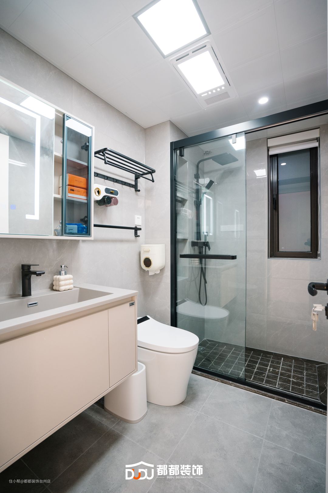 卫生间的干区单独拎出,实现布局的干湿分离,白色岩板台面,配合台中盆使用,整洁干净而无卫生死角;下方悬挂抽屉柜,物品拿放变得十分方便,给人一种很整洁的素雅感。