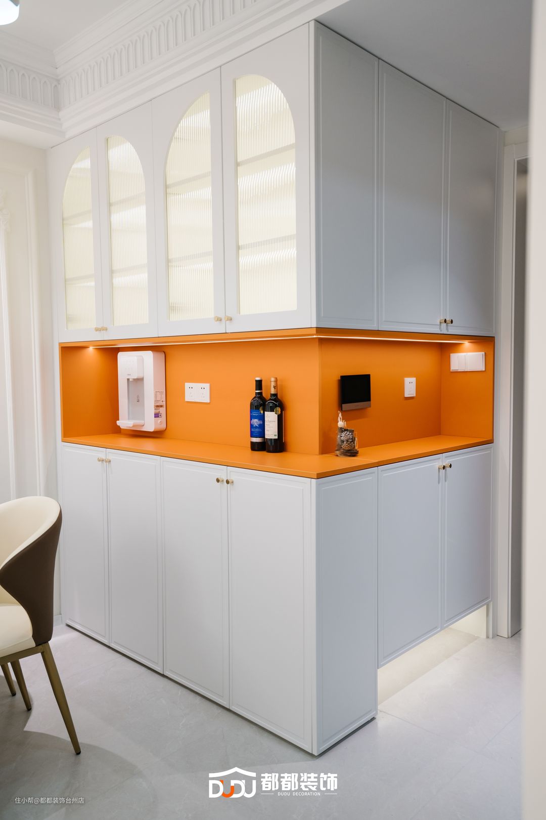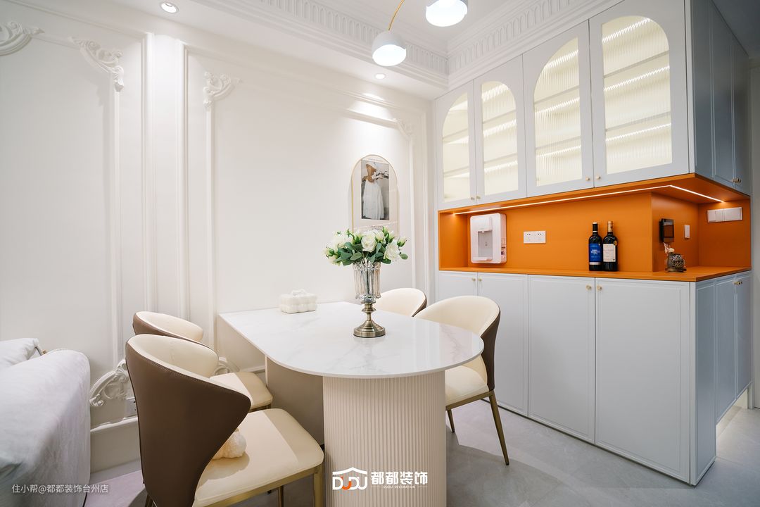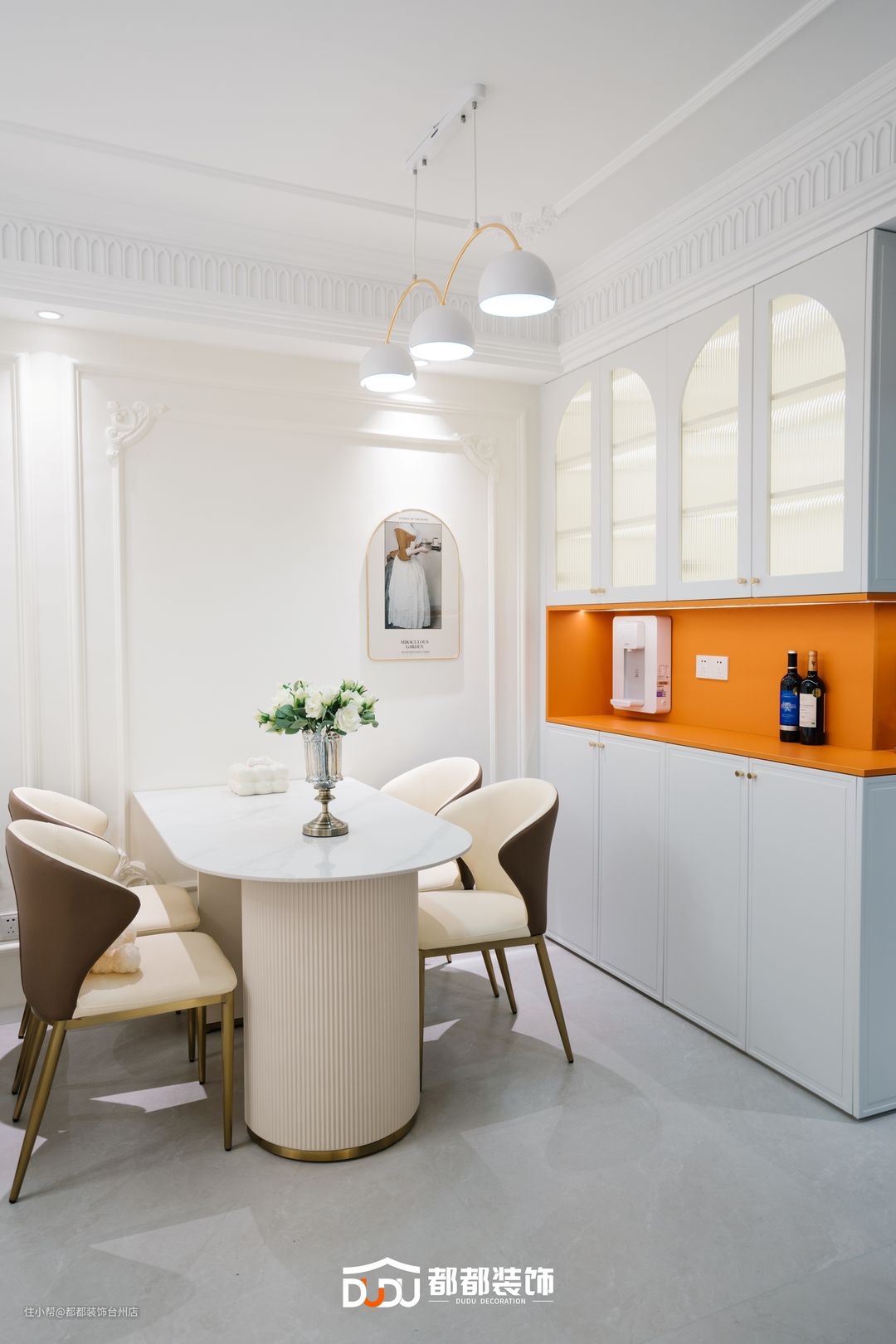 客餐厅一体节省空间,简约式大理石餐桌搭配上金属色的餐椅,打造出静谧的浪漫美感。餐厅区域光线柔和,营造了满满的浪漫氛围感。 由于进门处的空间较小,设计师把餐边柜和玄关鞋柜连在一起,做成L型转角柜,中间悬空加上女主人喜欢的爱马仕橙,一抹鲜艳的颜色带来丰富的视觉享受,这样设计让小户型的空间看起来更加轻盈、通透。
