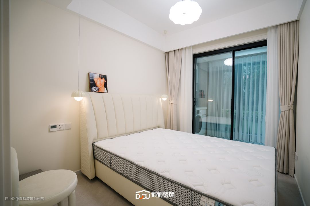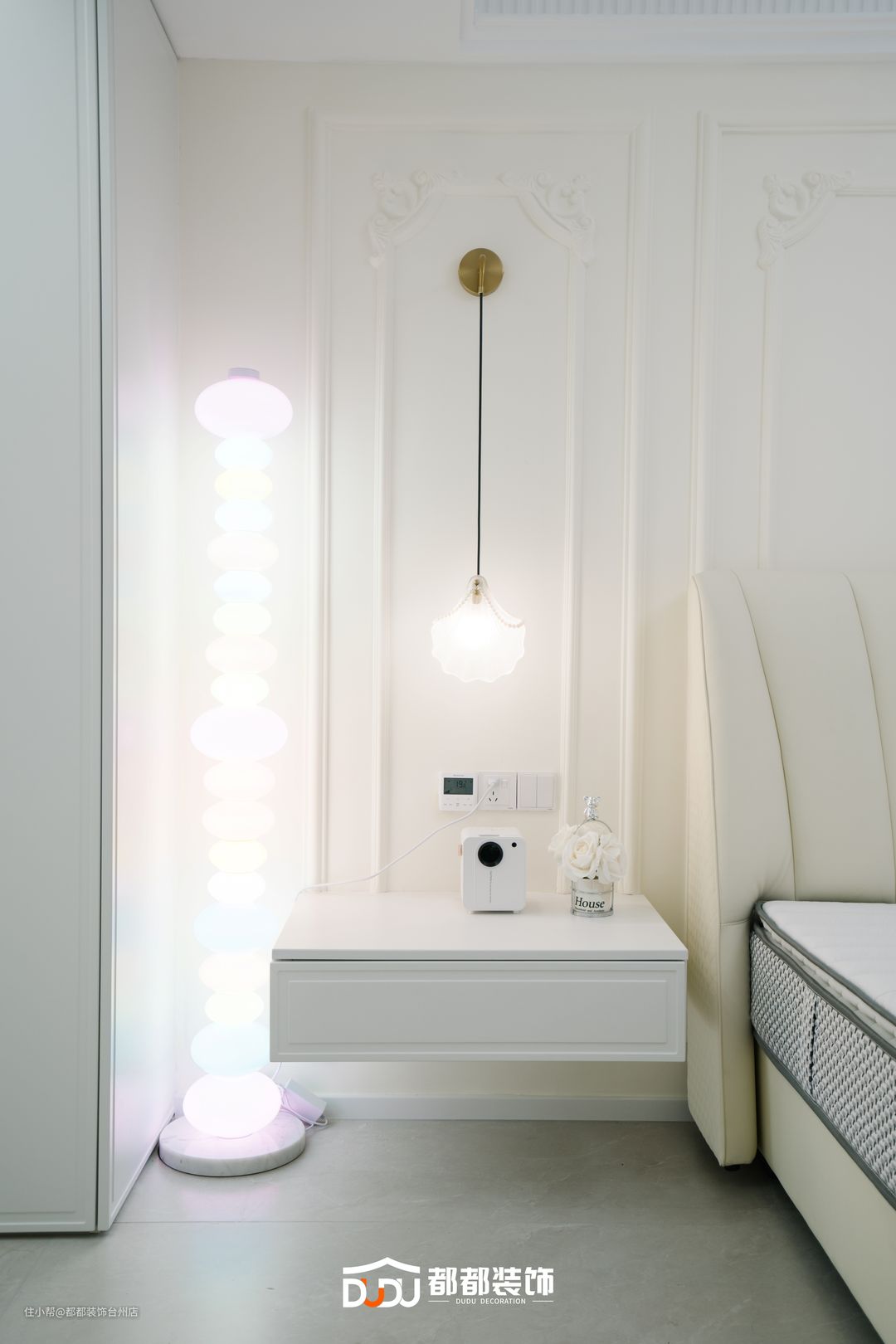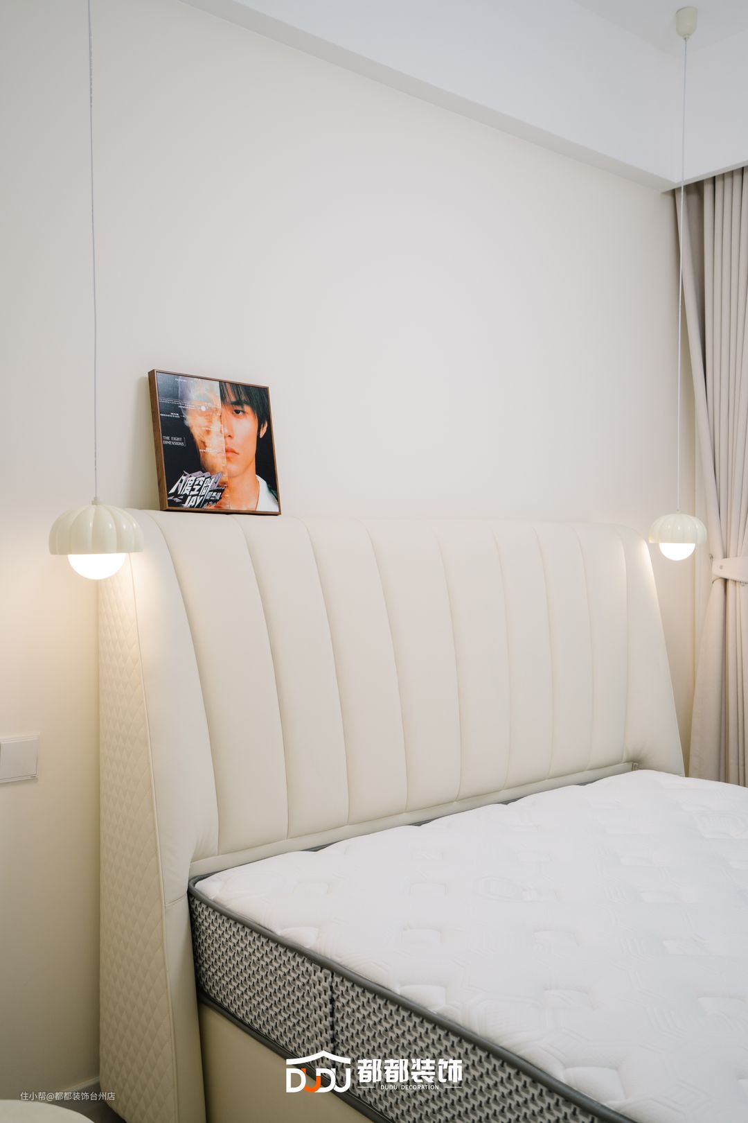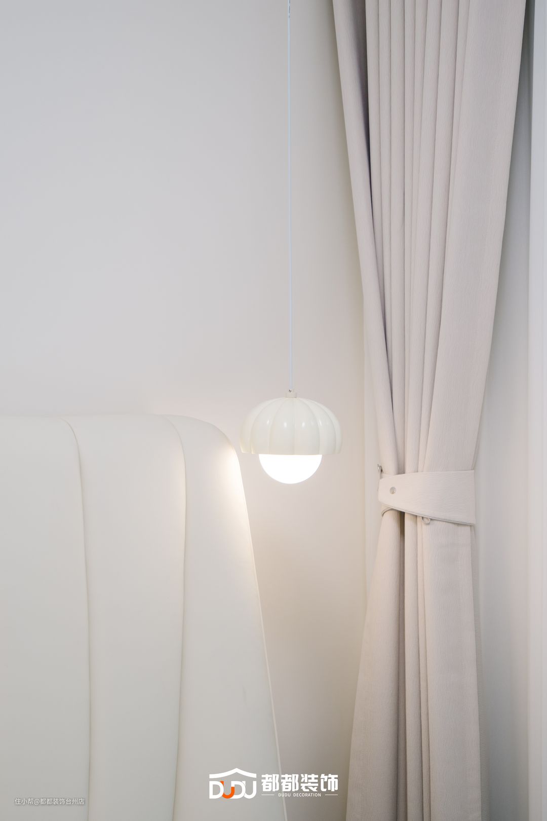 次卧以奶油白色为基调,布置一张白色软包床,奶白色云朵灯软糯可爱,让简单的空间增添了甜蜜温馨而唯美浪漫的氛围。